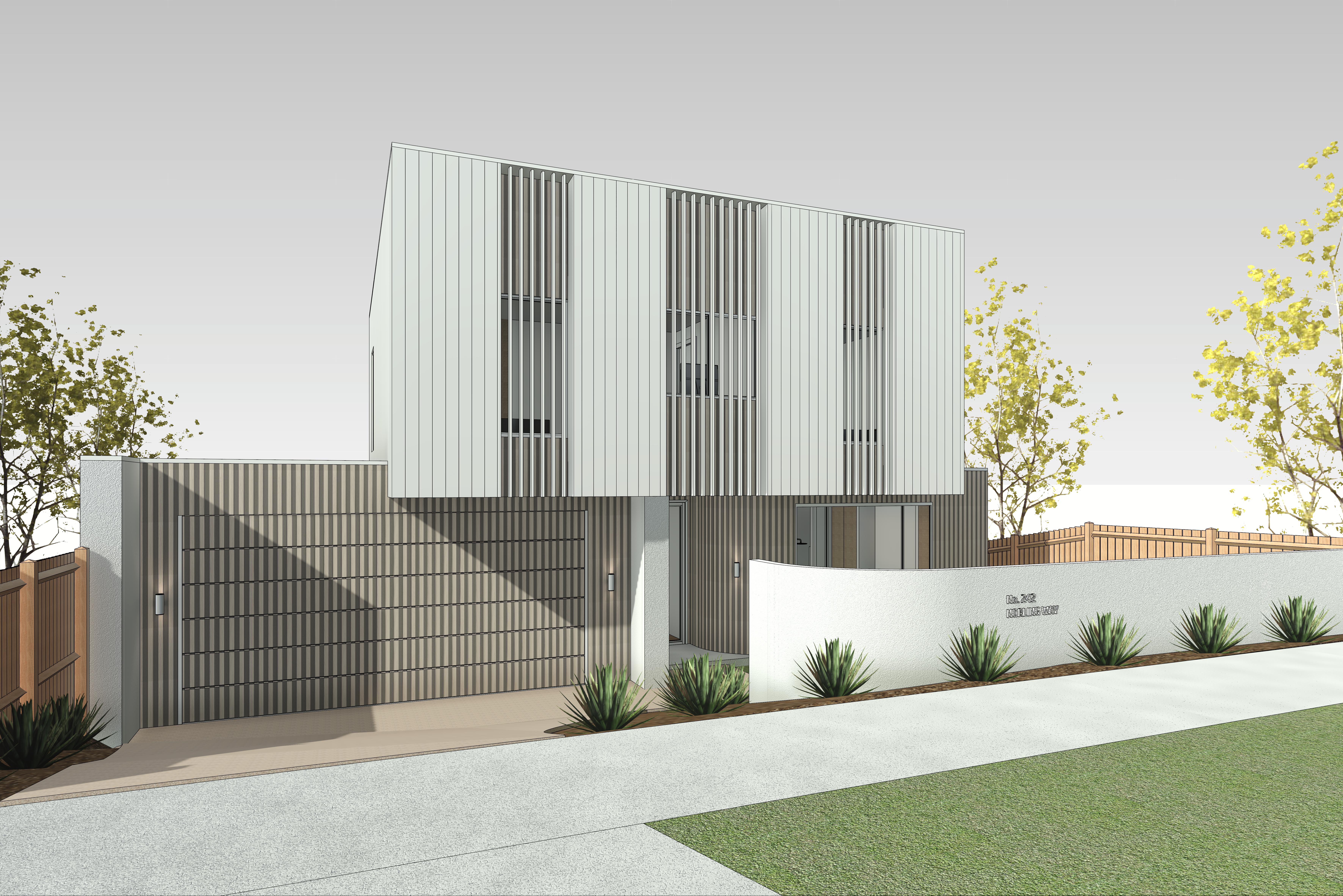modern two story beach house located in australia white render cladding vertical hardwood beach timber cladding timber batten screening over upper floor windows curved wall in entry nib brickwork walls either side of garage door landscaped front garden with mulch garden beds bushland feel and tall trees behind building in background blue sky day with morning sunlight from the mid right hand side