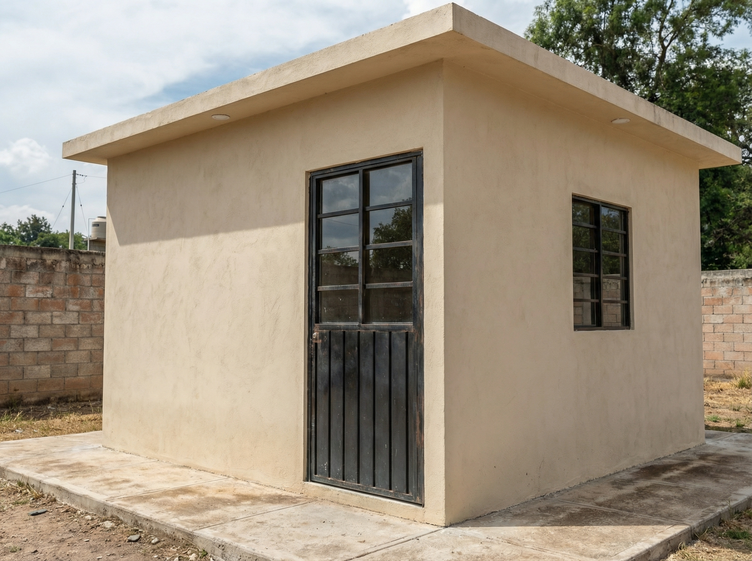 new institutional public housing module render social support housing unit government public works project single story small housing module flat concrete roof simple plastered walls low cost construction fixed budget materials white institutional walls with subtle texture gray metal door and window simple concrete slab base realistic construction details natural daylight lighting soft sun shadows realistic ambient light no dramatic lighting context compacted dirt ground simple concrete sidewalk rural semi urban environment minimal vegetation basic utility pole water tank in background include subtle human scale reference simple silhouette or bicycle style realistic architectural visualization public infrastructure project non luxury non commercial dignified social housing camera frontal isometric view technical composition documentary style government presentation render materials realistic plaster texture concrete texture metal matte finishes mood clean functional institutional neutral sober dignified no luxury materials no decorative elements no landscaping design no modern design elements