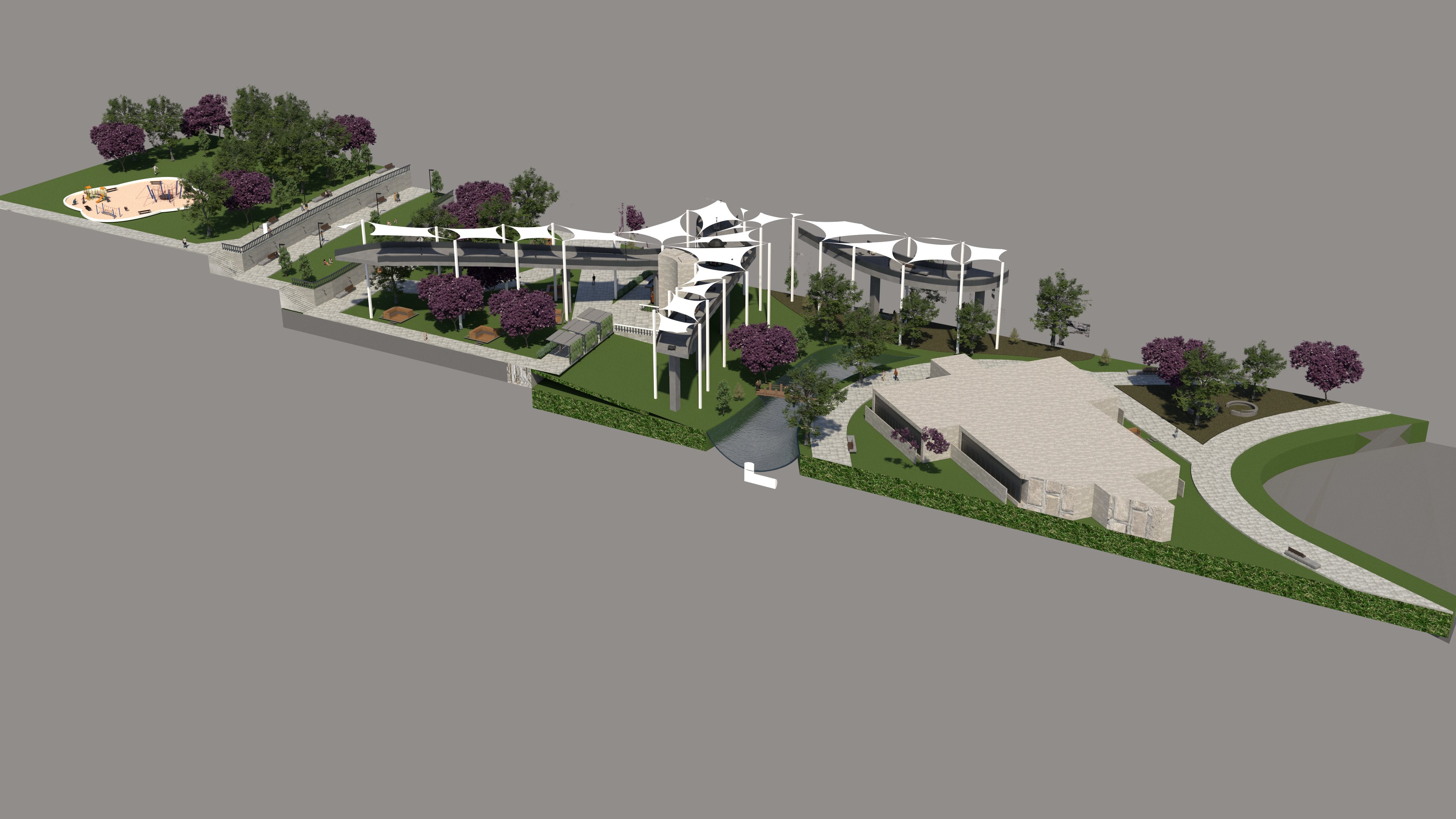 make a diagrammatic drawing of this render include details on how runoff water is stored in the pond