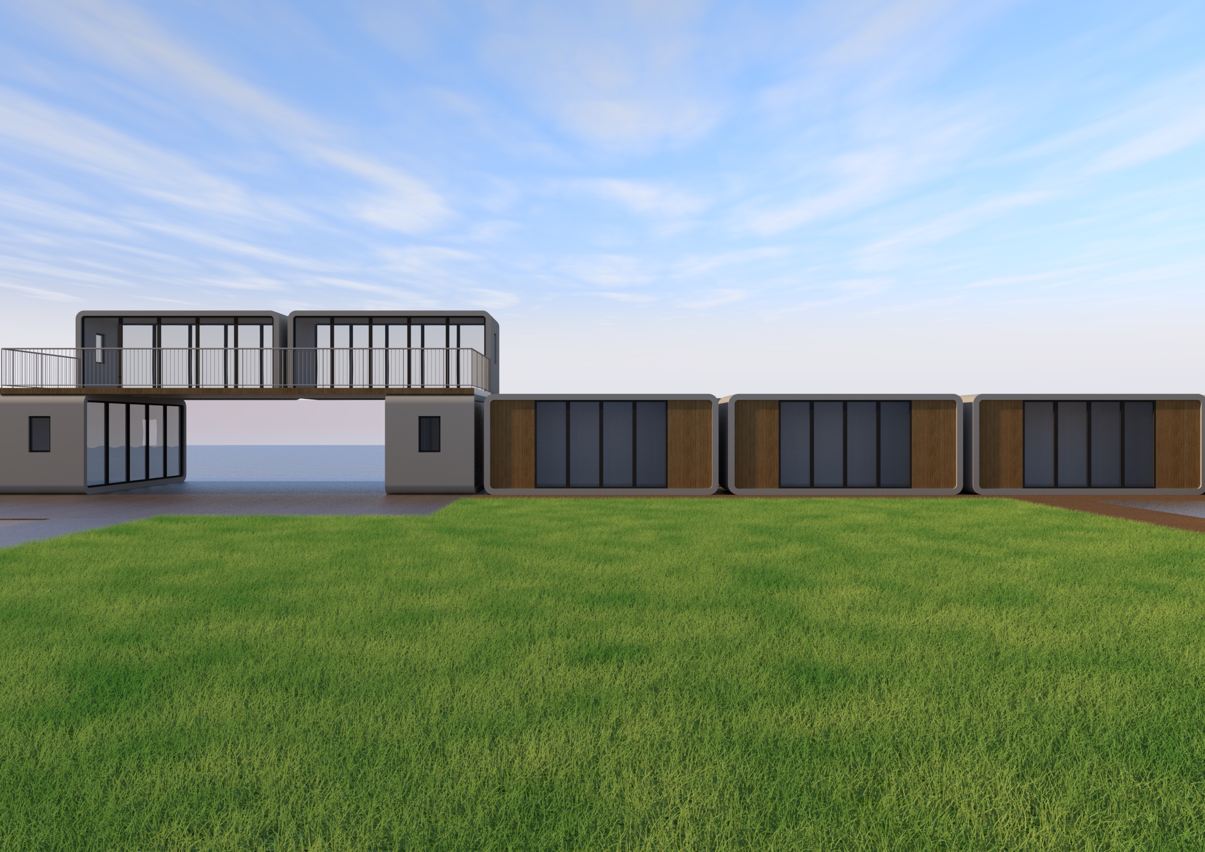 high end architectural visualization based strictly on the provided image important constraints must follow keep the existing architecture 100 unchanged no new buildings no extra containers no added volumes do not modify move resize or reinterpret the existing structures preserve exact geometry proportions spacing and composition intervention is allowed only in the foreground lawn area background buildings terraces and modules must remain identical to the source image only enhance materials lighting and atmosphere subtly style luxury mediterranean beach club with contemporary minimalist design natural materials warm and inviting atmosphere landscape intervention only in the grass area transform the lawn into a refined landscaped garden while preserving openness introduce subtle organic pathways sand and wpc decking naturally integrated clean curated composition minimal and elegant no clutter water features key element vertical water fountains designed as minimalist steel porticos thin rectangular frames made from brushed or weathered steel integrated vertical linear water jets inside the frames soft cascading water and fine mist elegant well spaced placement within the landscaped area subtle wet reflective surfaces beneath each fountain vegetation controlled coastal planting clusters not dense ornamental grasses lavender tamarix sea buckthorn keep clear visual corridors toward the architecture materials wpc decking walkways sand and coconut fiber paths light wood accents brushed steel elements lighting atmosphere important golden hour sunlight soft warm tones cinematic shadows introduce a soft sunny haze in the background background elements far buildings horizon distant details slightly obscured by warm atmospheric haze maintain foreground crisp and detailed gentle light diffusion and atmospheric perspective realistic reflections on glass steel and water subtle glow on water features atmosphere relaxed luxury airy elegant uncluttered soft depth of field very subtle people optional sparse elegant guests not crowded rendering quality ultra realistic 4k resolution cinematic composition color palette neutral sandy tones warm wood natural greens subtle water reflections dark steel accents negative prompt very important no new buildings no extra modular units no containers added no architectural redesign no change in camera angle no change in building layout no dense or chaotic landscaping no heavy fog keep haze light and warm not opaque