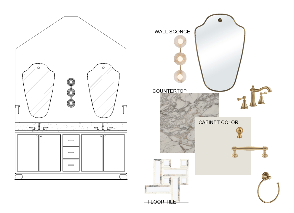 timeless feminine bathroom vanity light paint on sabinet with marble countertop per swatch two bras smirror above sink iwth brass fixtures and bun foot for toe kick