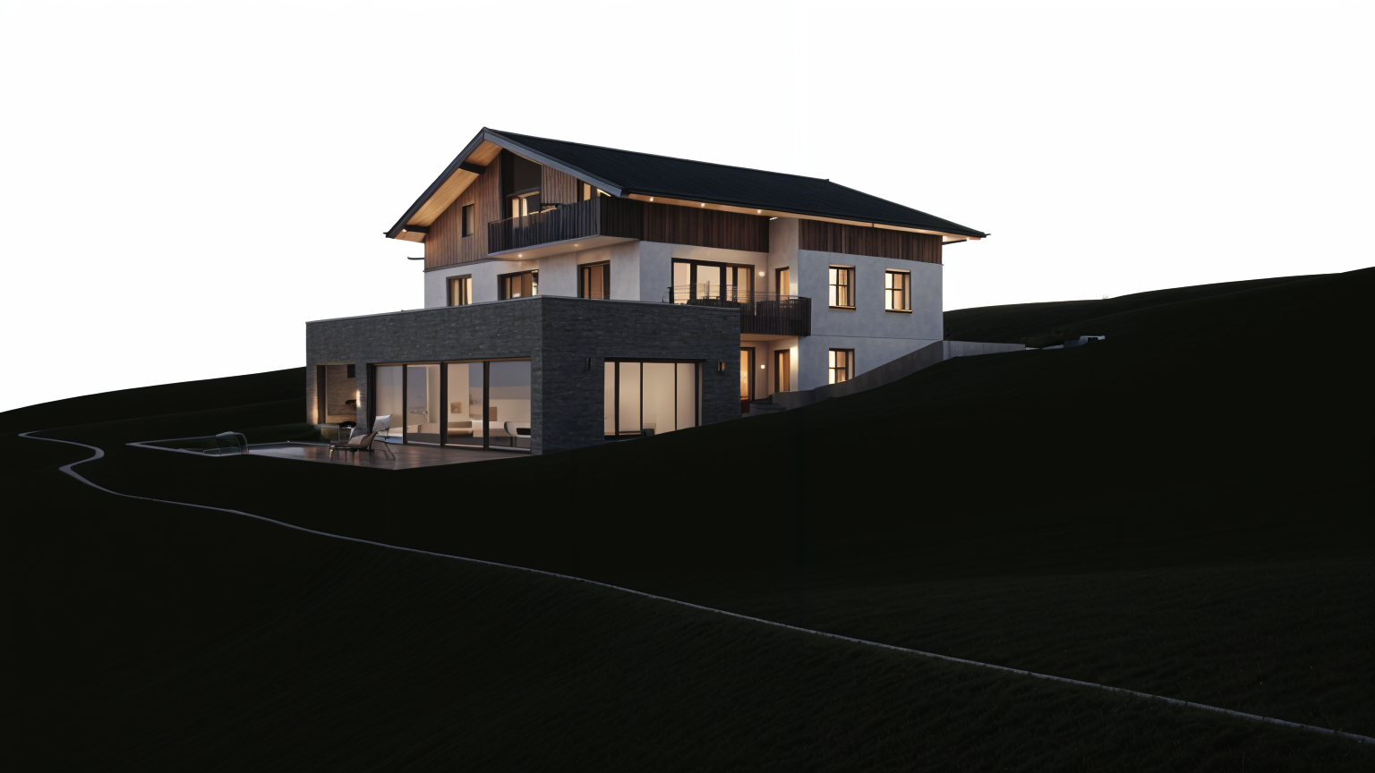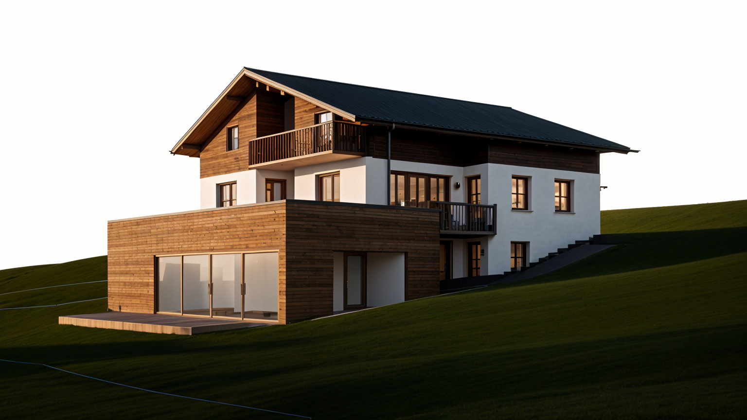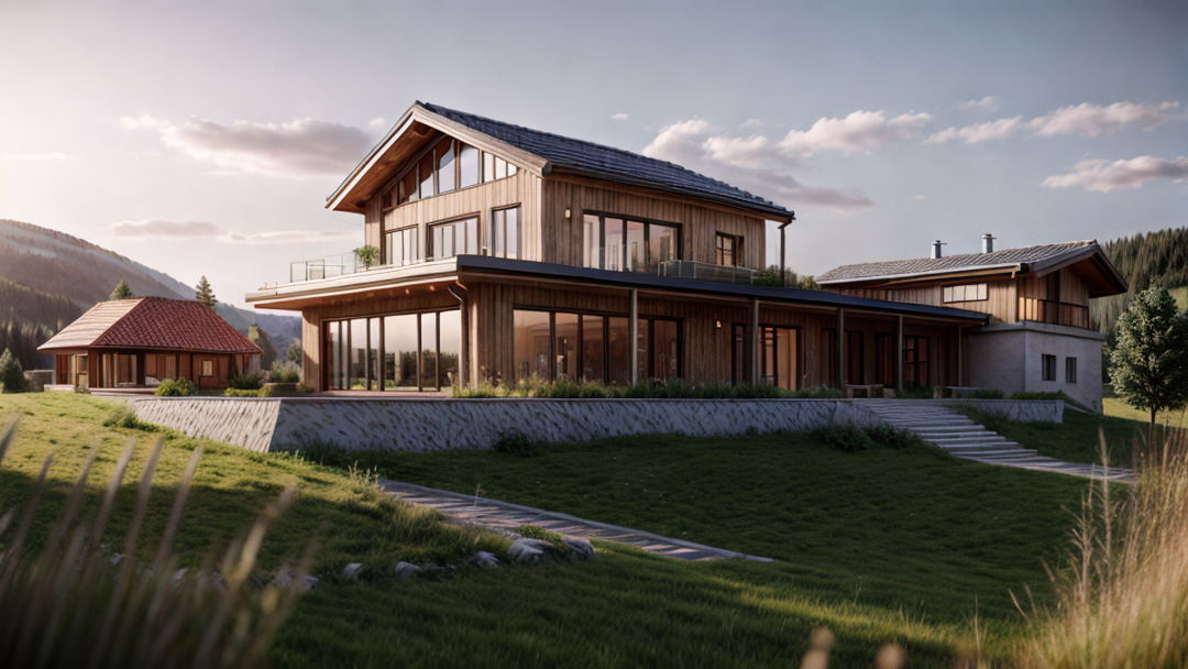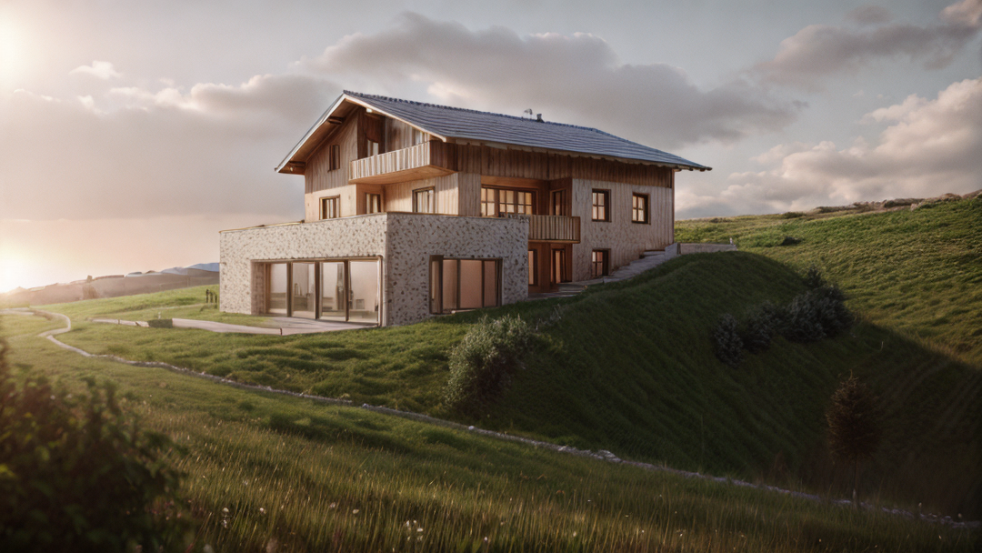 a beautifully rendered backyard scene featuring a charming brick house the house is constructed with classic reddish brown bricks and features a dark brown roof the windows and doors are painted a soft mint green adding a touch of freshness the pergola adorned with lush green vines provides shade over the patio area where natural wood chairs and a table are set the stone path leading to the house is composed of light gray stones blending harmoniously with the vibrant well manicured green lawn surrounding the garden are dense rich green hedges creating a sense of privacy and tranquility the sky above is a soft blue dotted with fluffy white clouds and the sun casts gentle warm light over the entire scene creating a peaceful inviting atmosphere architecture
