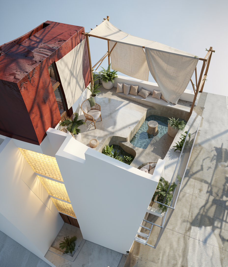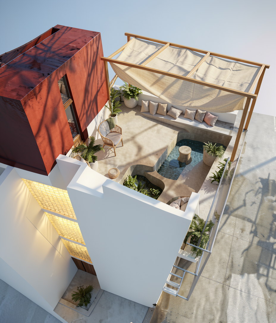 above the pillows in that side add small about 2 5 meters in height short and smaller in length than the terrace fitting within boundary of white concrete element thin wooden pergola with beige linen fabric cloth draped for shadow to the pool pergola scaled down to half