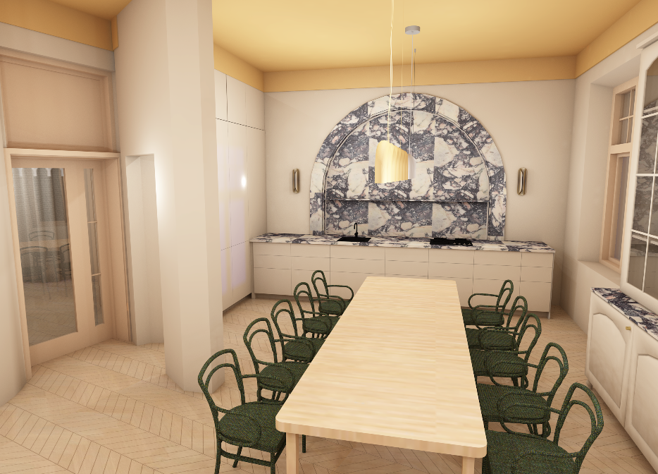 ok mnow put som plates glases an cutlery on the table the plates can be in a beige color make the hairs in a more homogen green pleae