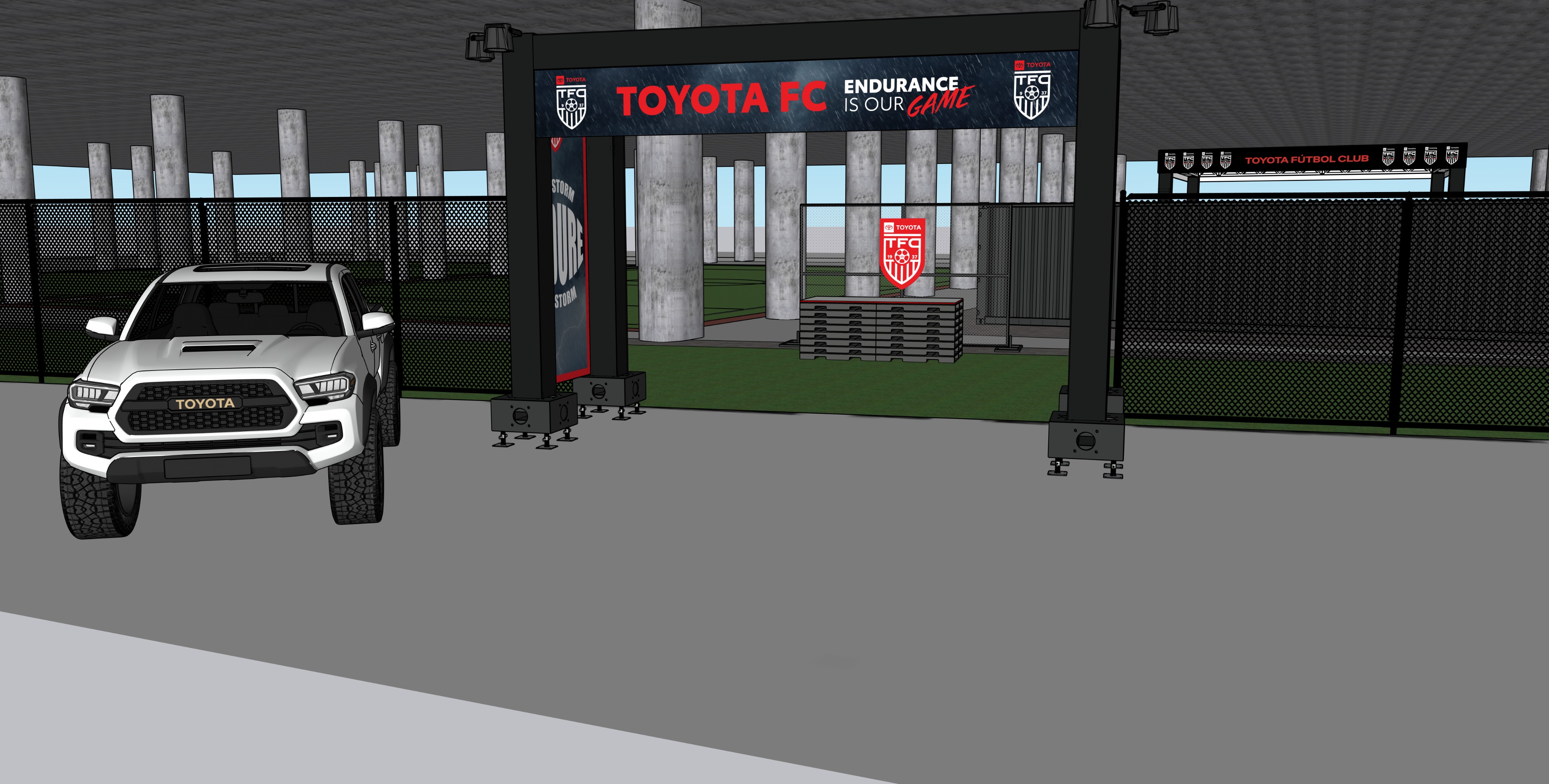 a modern sports complex with a series of enclosed soccer fields and adjacent structures each field is surrounded by tall cylindrical concrete pillars that are light grey providing a fortified impression the fields themselves are lush green reminiscent of freshly cut grass bordered by subtle red lines the ground separating the fields is paved with a soft grey stone creating a neat pathway an industrial black storage container is positioned nearby contrasting with the bright white of parked suv vehicles the overall atmosphere is vibrant and dynamic capturing a sense of energy and readiness for action bright midday lighting enhances the vivid colors and clean lines adding to the sense of modernity and efficiency