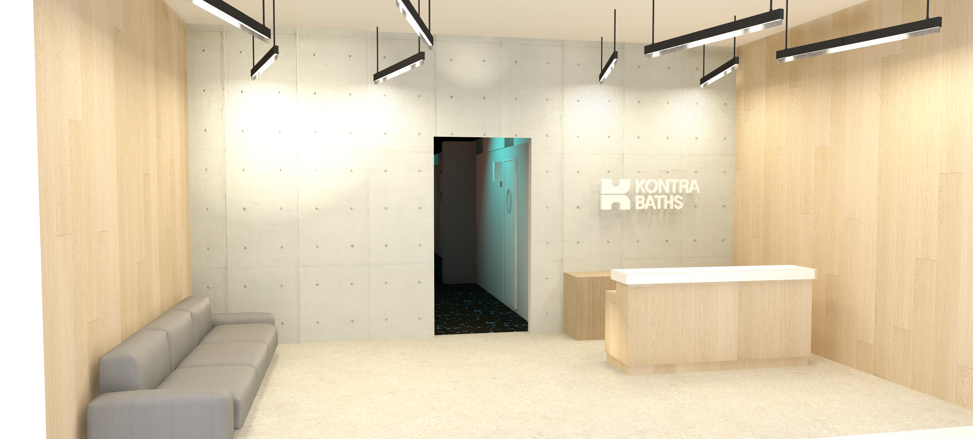 contemporary interior shot create a modern minimalist lobby interior with a sleek design the back wall is textured concrete and the side walls are warm wood planks the ceiling is an exposed industrial ceiling incorporate black minimalist pendant lights hanging from the ceiling for a touch of elegance the reception desk is light wood with a white countertop reflecting simplicity and functionality add a gray sofa on the left for a comfortable waiting area matching the overall subdued color palette the right and left walls a natural wood texture adding warmth to the space ensure the lighting is soft yet sufficient to create an inviting and professional atmosphere left and right walls are wood hallway should emit a glowing red and blue light architecture