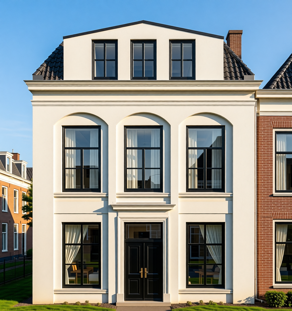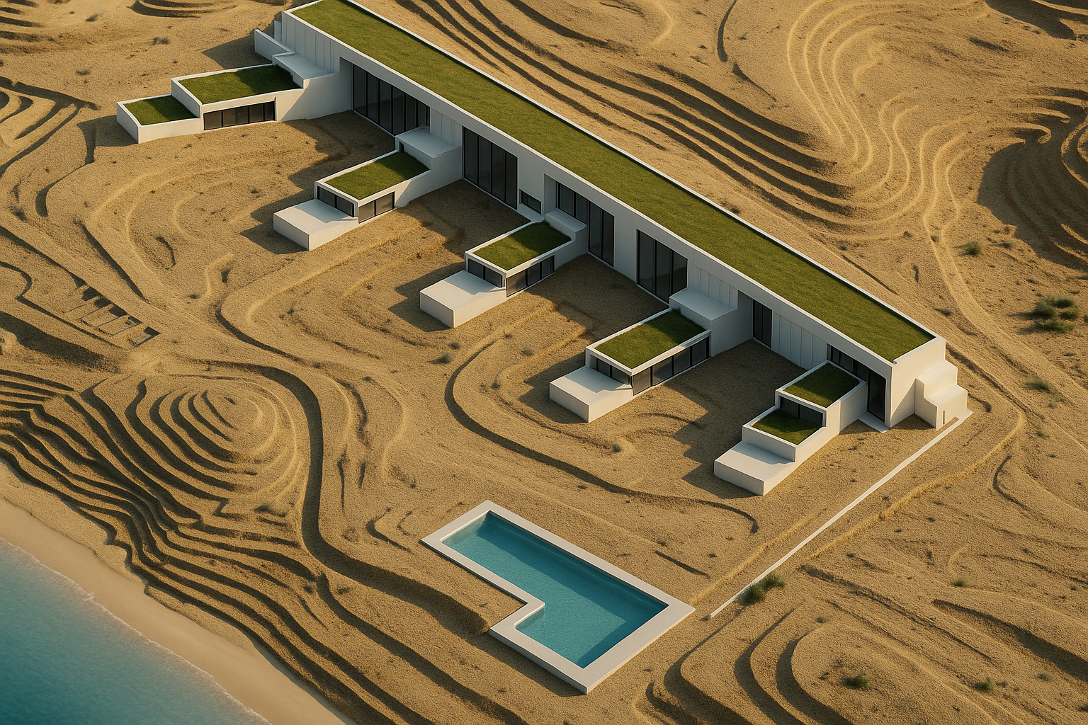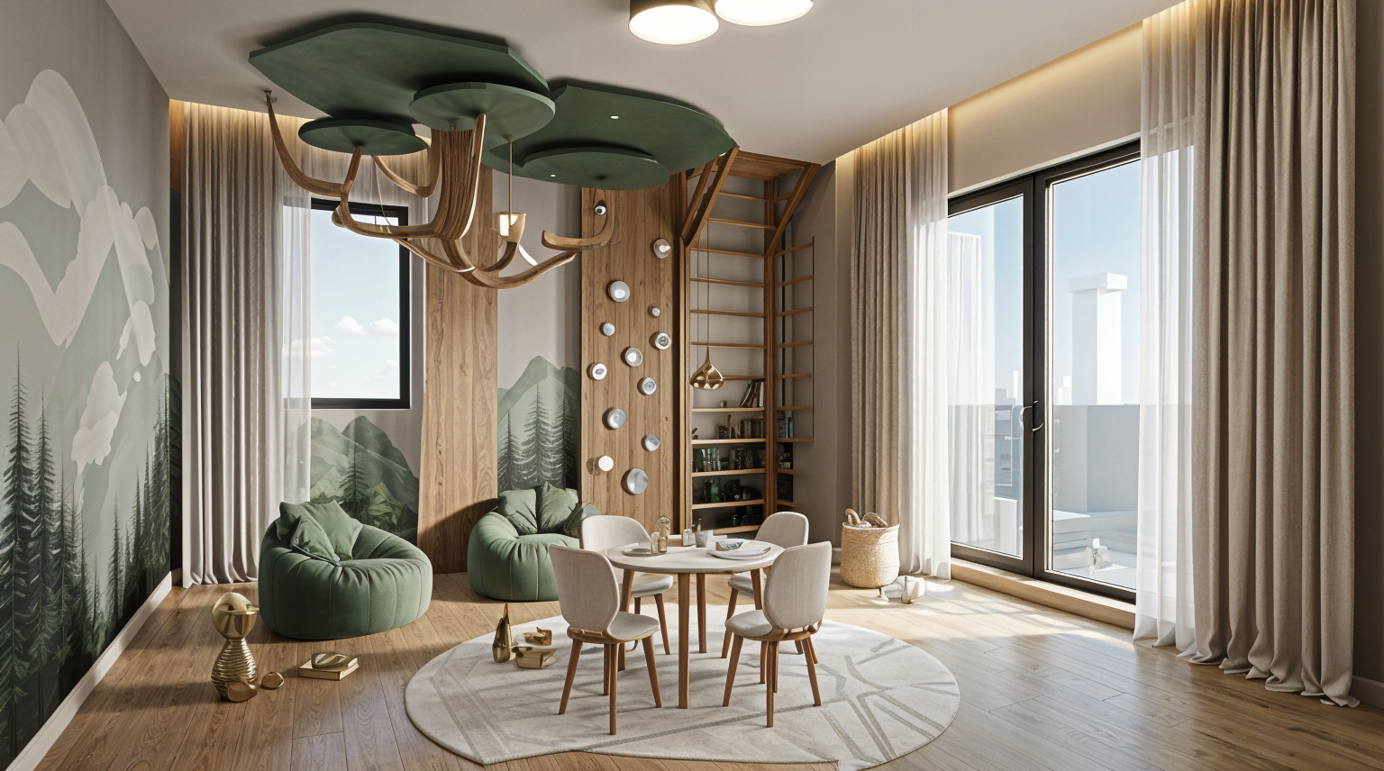 render a modern interior design scene with a minimalist and warm atmosphere create a spacious kitchen and dining area featuring sleek neutral tones use a soft beige and taupe color palette for the cabinetry and walls incorporate natural wood textures in the dining table and cabinetry accents design a white marble fireplace surround for elegance add contemporary elements such as pendant lights with a soft white glow include subtle greenery by the window for a refreshing touch emphasize a clean bright and inviting atmosphere with ample natural light filtering through large windows keep the fire burning in the fireplace make the outside environment more natural