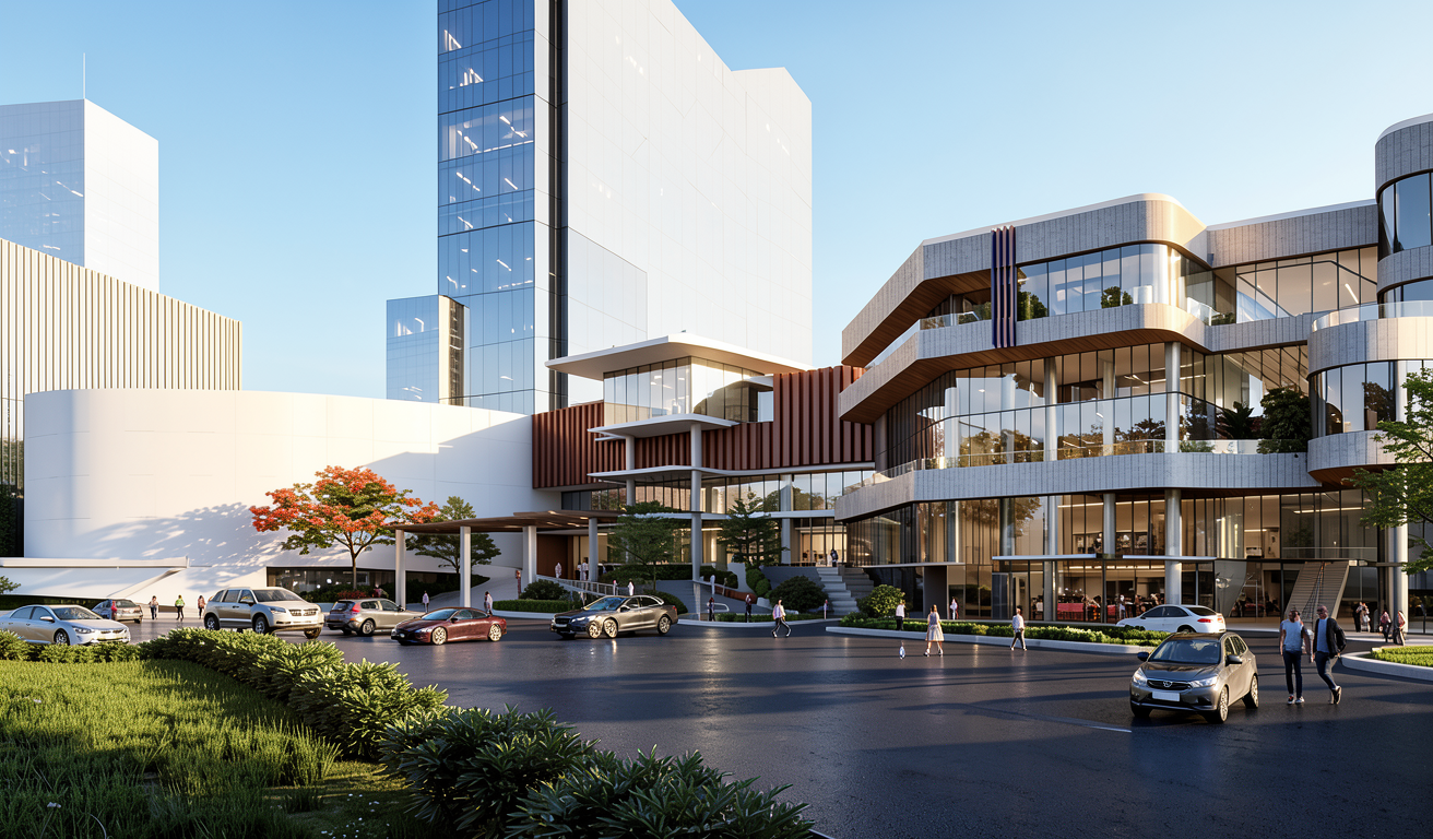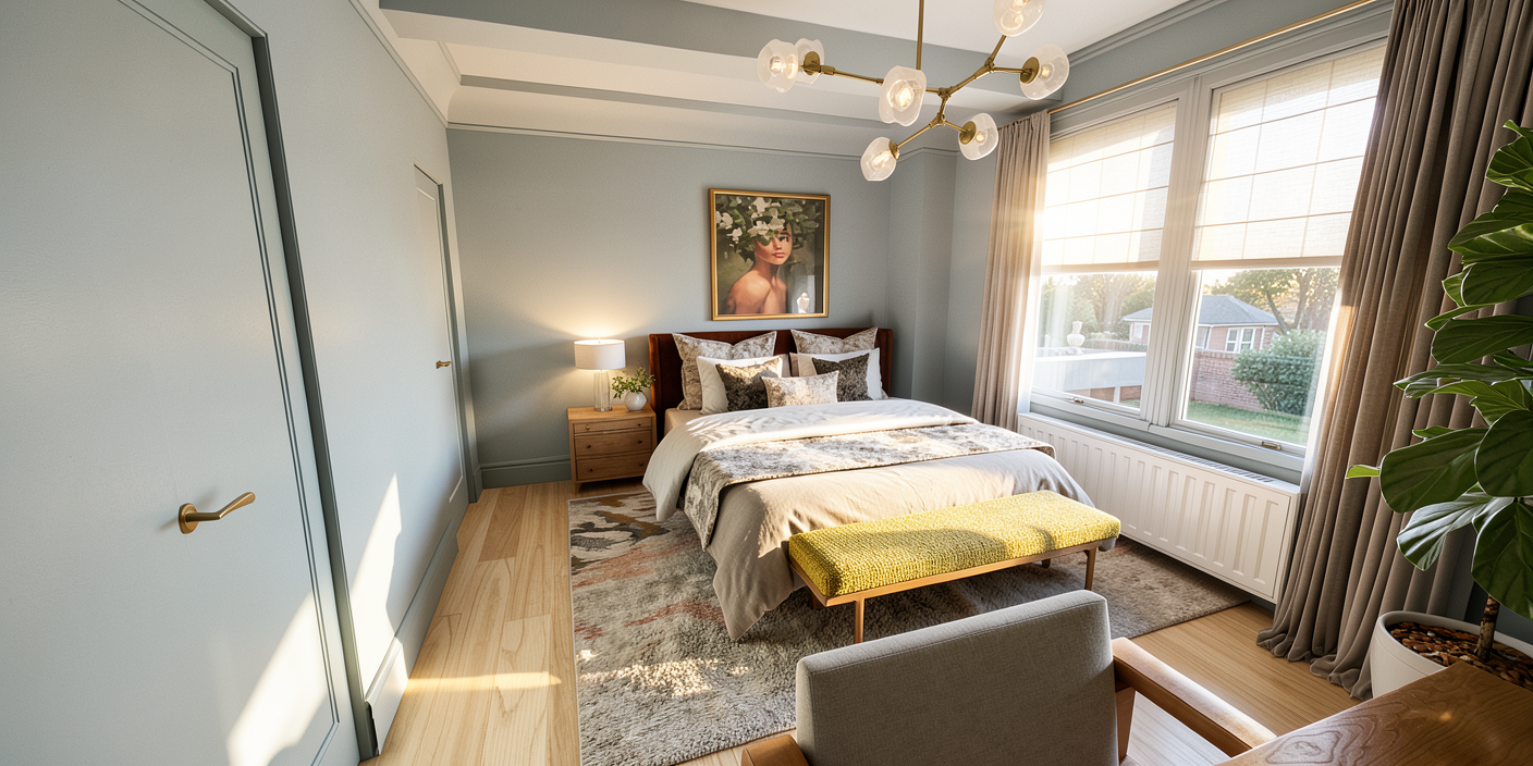 bed has a gold metal frame around the blue fabric the nightstands are a dark walnut the dresser on the right is black the floor is a off white carpet the lamp shades are pleated add brightness to the ceiling light and the wall sconces the curtains are a cognac color