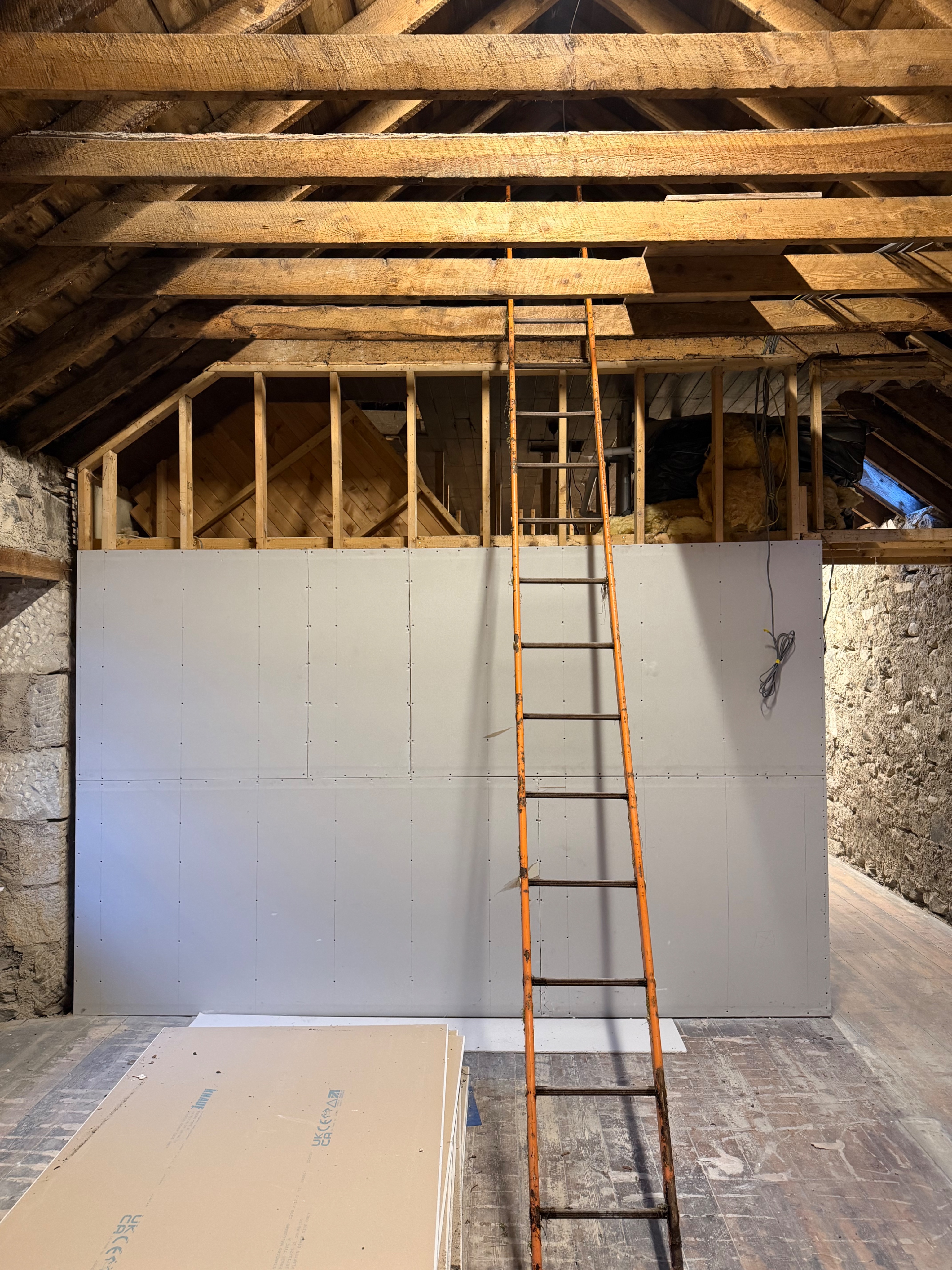 please plaster the wall in front and put a farmhouse table in the room with bench seating