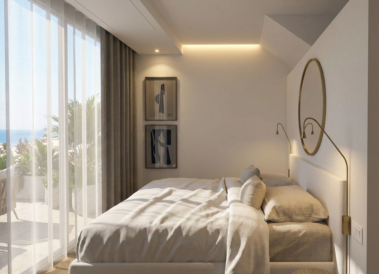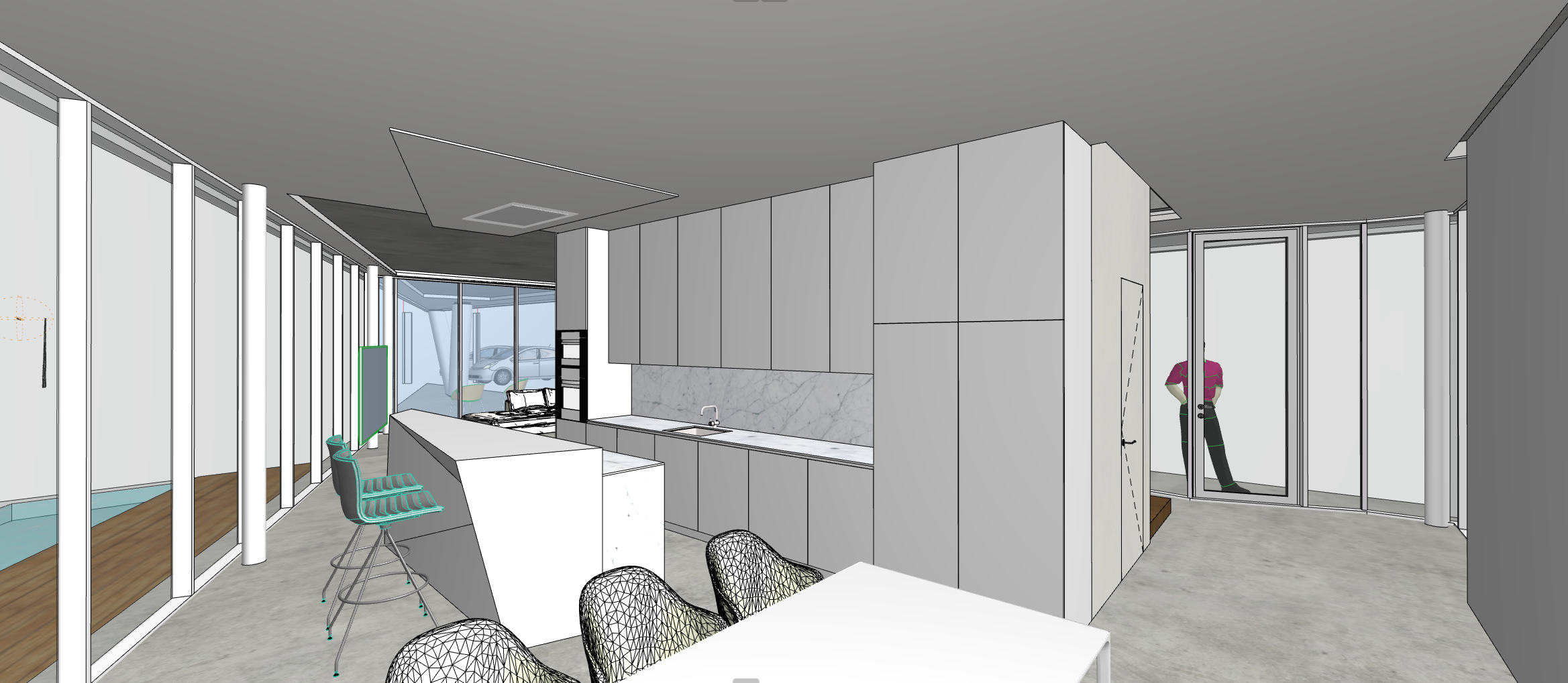 high end 3d architectural visualization of a modern minimalist kitchen the design features sleek handleless cabinets in glossy white finish paired with a premium grey stone countertop and backsplash incorporate warm wood accents through open shelving and a breakfast bar include integrated led strip lighting underneath the upper cabinets casting a soft glow on the stone surface natural sunlight streaming through a large window photorealistic 8k resolution cinematic lighting clean lines ultra modern aesthetic