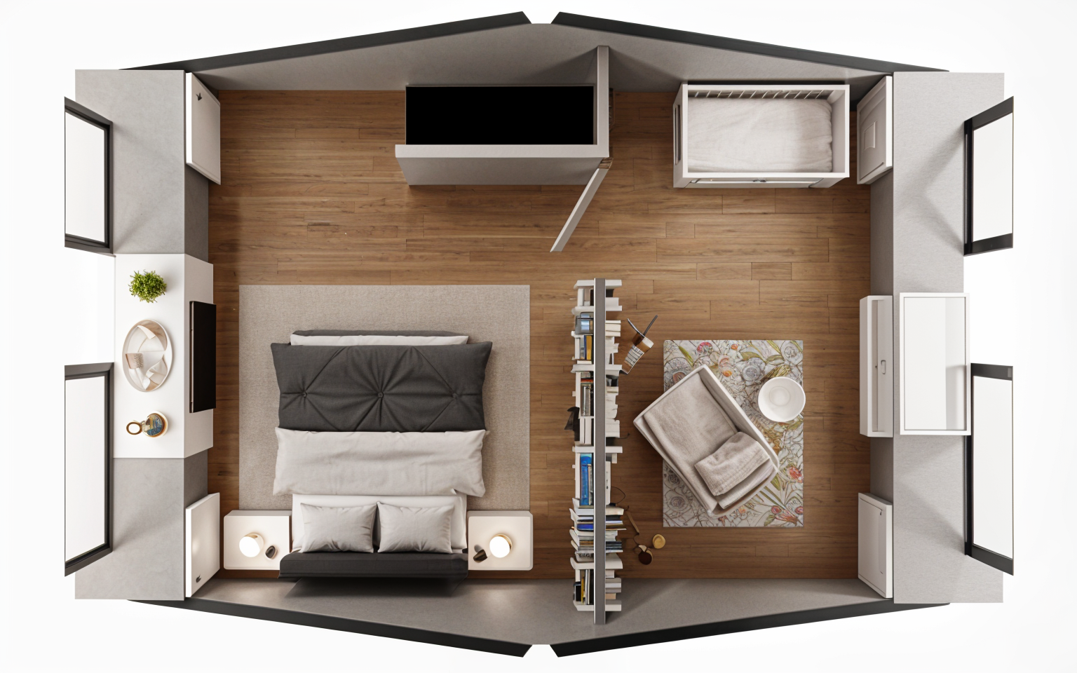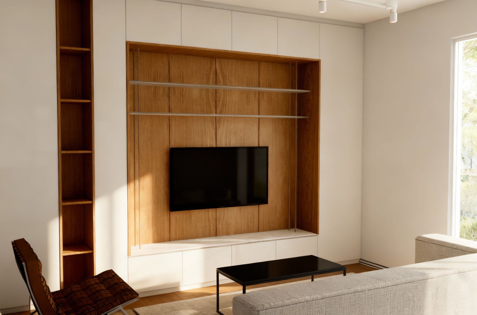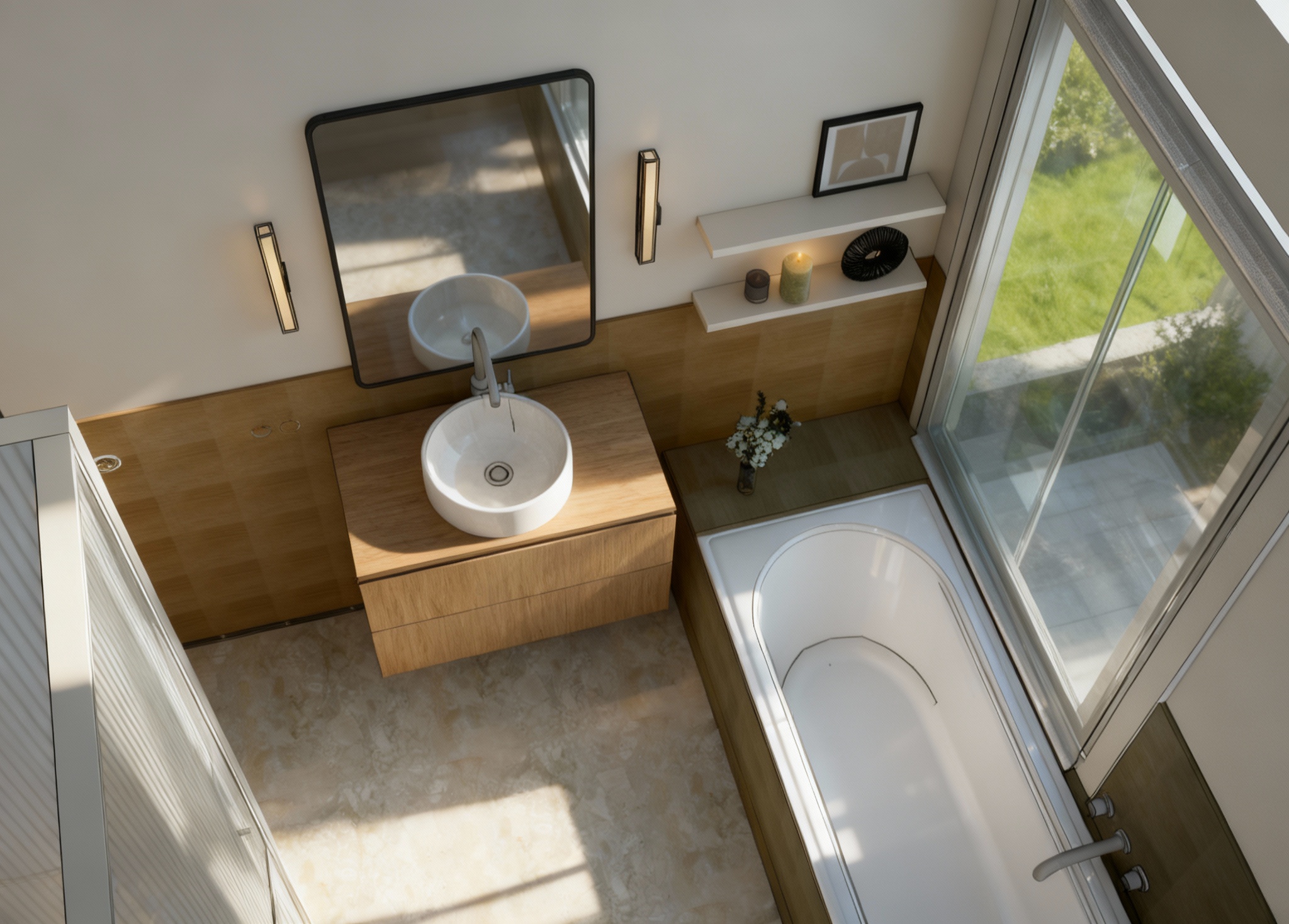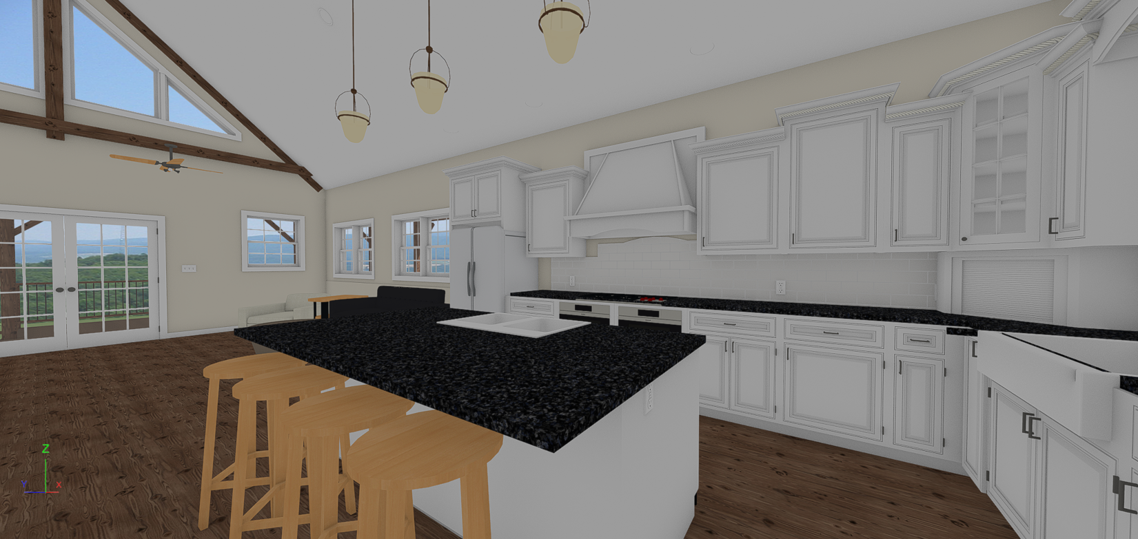 create a high resolution ultra realistic rendering of a modern farmhouse style open concept kitchen and living space retain all existing layout and design elements white cabinetry with crown molding black granite countertops a farmhouse sink and a large kitchen island with wooden bar stools the space should feature natural textures and lighting with realistic wood flooring and soft reflections on metal and granite surfaces large windows reveal a lush forest like environment outside with sunlight filtering through the trees and casting soft natural shadows across the room ensure realistic materials for wood stone metal glass and paint for a polished inviting atmosphere