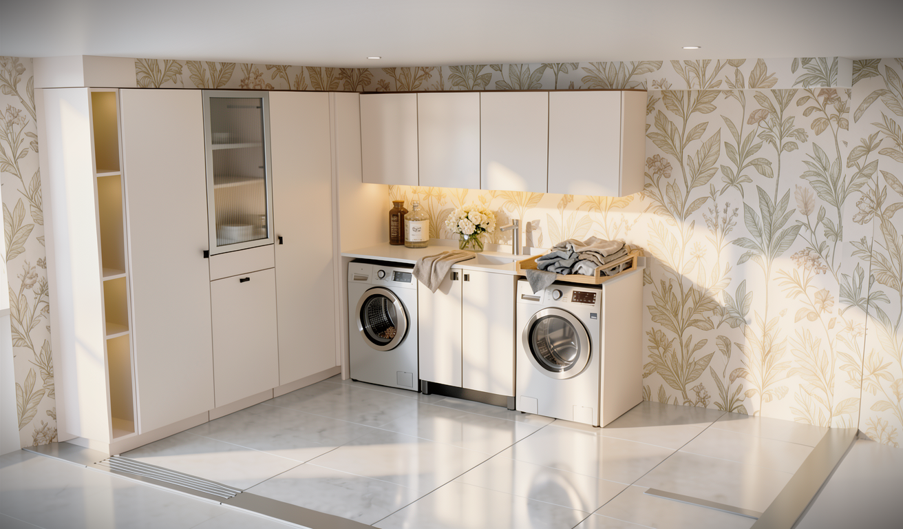ponme un papel adecuado para cuarto de lavado quiero que quites las baldas que tiene el mueble columna que no tiene puertas