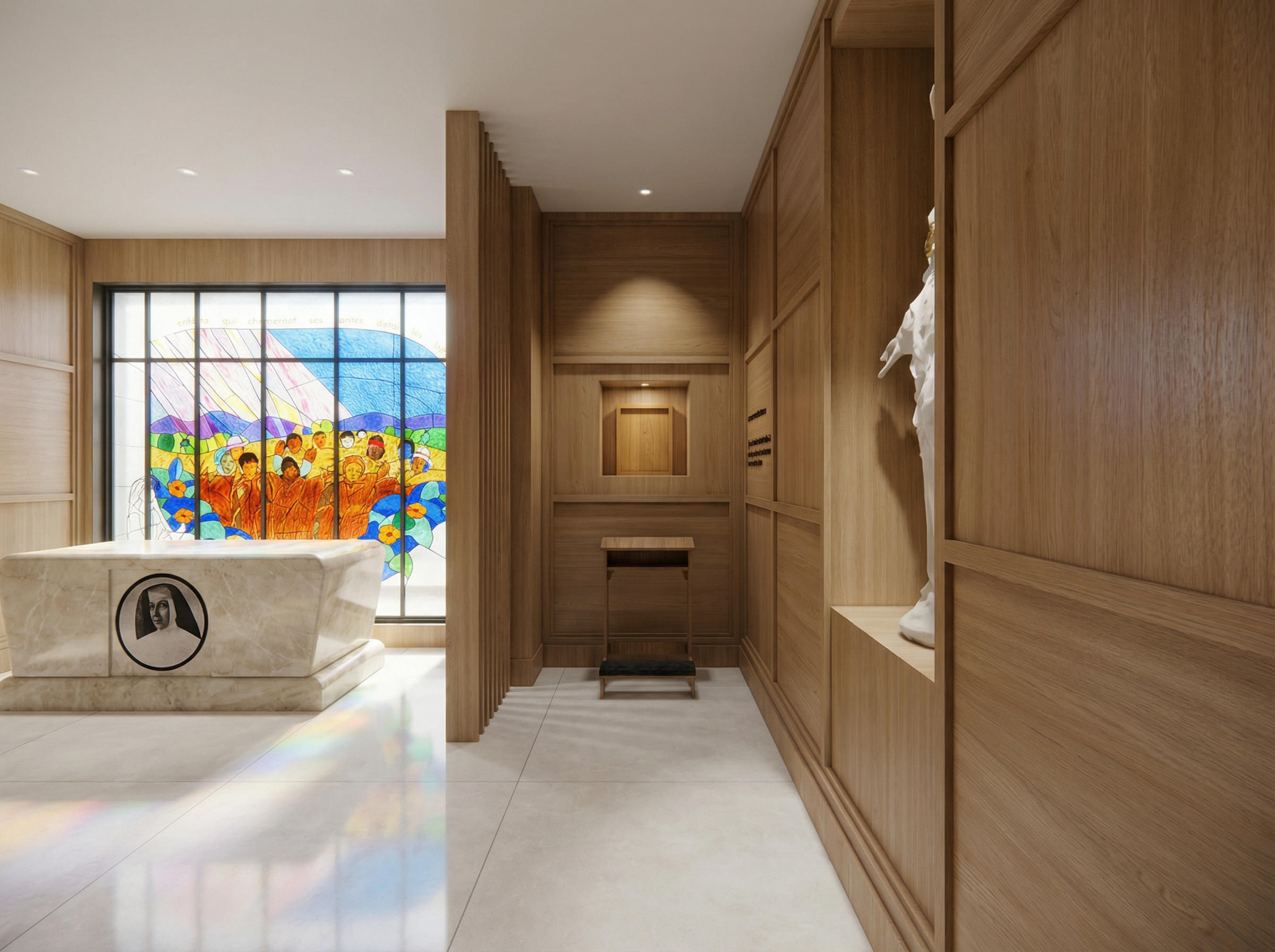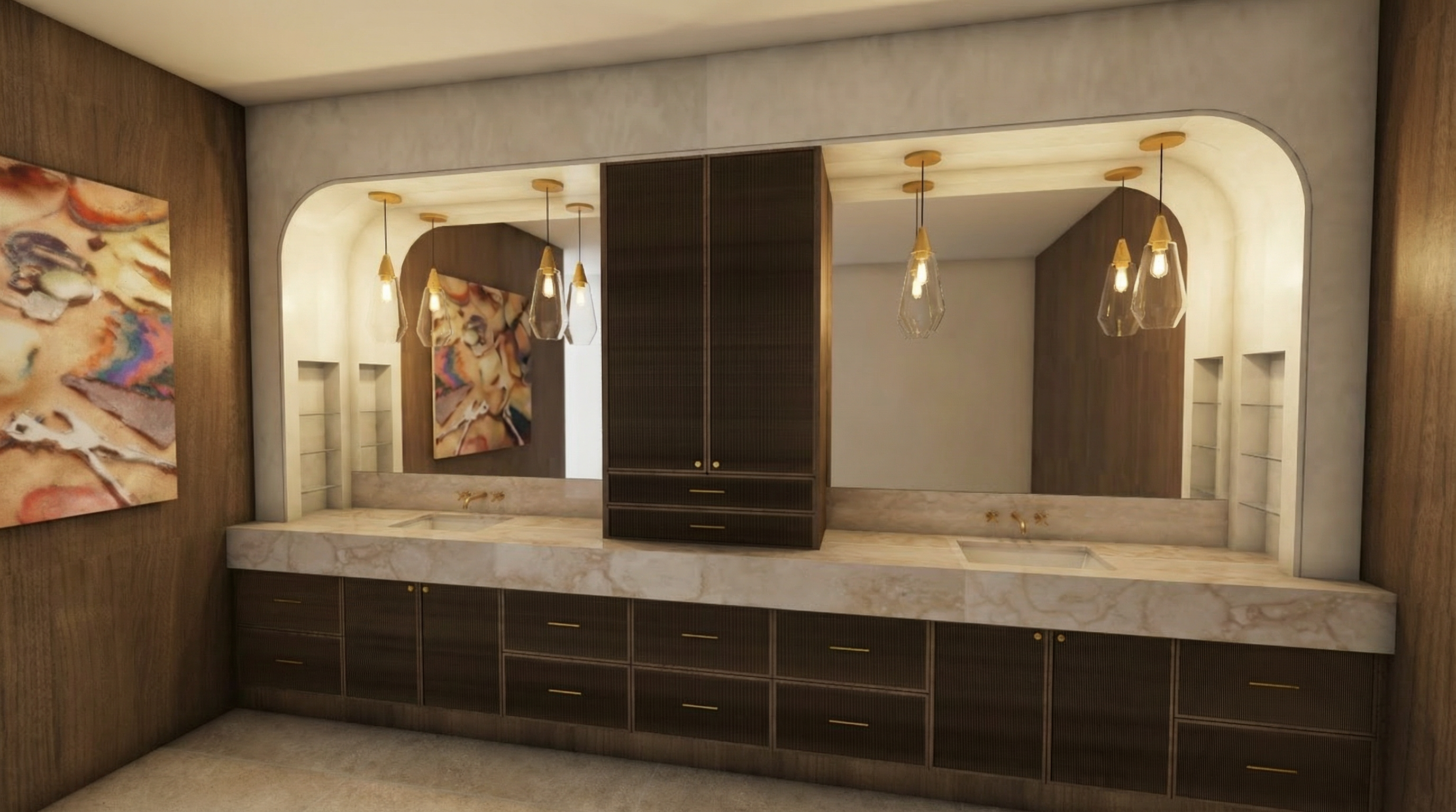 photorealistic architectural interior render absolutely do not change the camera angle perspective room proportions wall angles ceiling height amber terracotta ceiling white plaster walls or polished concrete floor from the reference image provided render from the exact same viewpoint as the reference a row of 4 simple flat spa daybeds placed along the back wall each daybed is a low rectangular bed with a slightly angled headrest clean smooth surface with a white mattress and white pillow on top each bed sits on a simple low wooden base between each daybed a floor to ceiling frosted glass panel as a private divider the entire back wall behind the beds is a water wall a thin sheet of water flowing silently down the full height of the wall from top to bottom dark slate stone behind the water making the flow visible and luminous track lighting on ceiling rails with black adjustable spots throwing warm beams downward warm amber ceiling polished concrete floor only 2 people lying on the beds in white spa robes relaxed and still no plants no sculptures no futuristic elements no extra decoration photorealistic render 8k 35mm lens warm cozy spa atmosphere