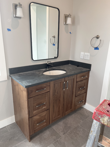 do not change the cabinets in any way preserve the exact cabinet colors materials finishes dimensions door and drawer styles hardware spacing alignment and all geometry exactly as shown do not alter the countertop shape backsplash appliances flooring lighting fixtures or wall structure only remove the construction materials clutter and mess from the scene clean the room and make it look finished and staged add a few simple tasteful home accessories appropriate for the style of the space but do not add or remove any furniture windows or architectural elements maintain the original lighting direction and realism enhance clarity and polish the photo while keeping the cabinetry and room design completely unchanged do not alter the lighting to keep the cabinet colors as they are in the image turn the lights on remove the blue tape hang a towel on the towel rod stage with gold accessories clean the dust off of the countertops
