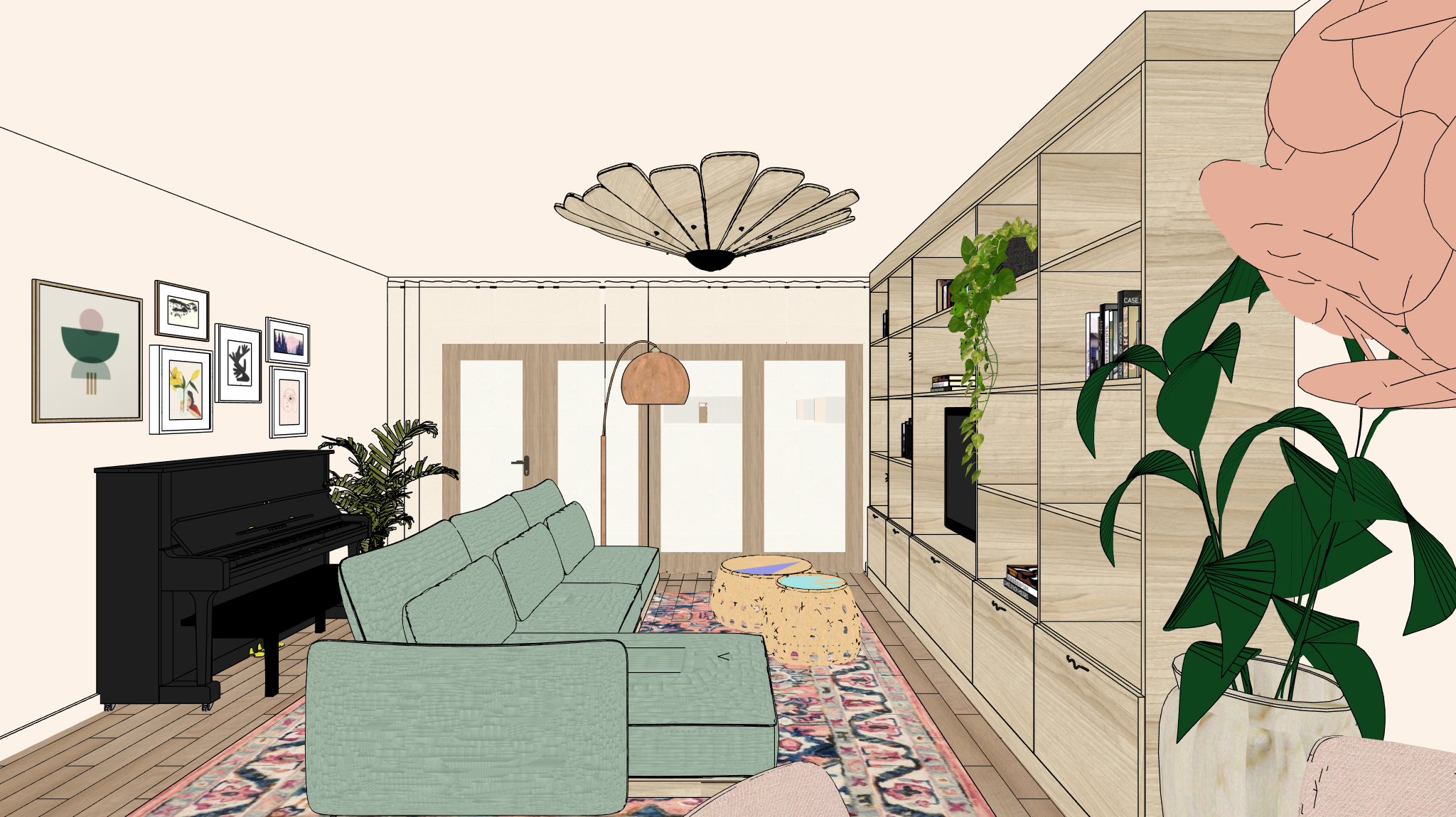 living room on the right there is wall to ceiling cabinetry with cabinets on the bottom and shelves above the shelves are lit with built in led strips emmitting soft light in the middle of it is the tv in the middle of the room there is an l shaped mint colored couch and two round wowen cain coffee tables next to the couch there is an arching copper floor lamp emmitting warm light on the left is a black upright piano with a piano bench above the piano there is artwork on the wall on the opposite wall there are huge windows that open to the garden warm daylight is pouring in through the windows in front of us and through the windows behind us on the right the windows have sheer curtains that are closed on the ceiling there is a huge ceiling light in the shape of a flower the petals are creamy white stone and the metal part of it is black matte wooden plank flooring in a soft shade a pink mint blue cream persian rug on the floor