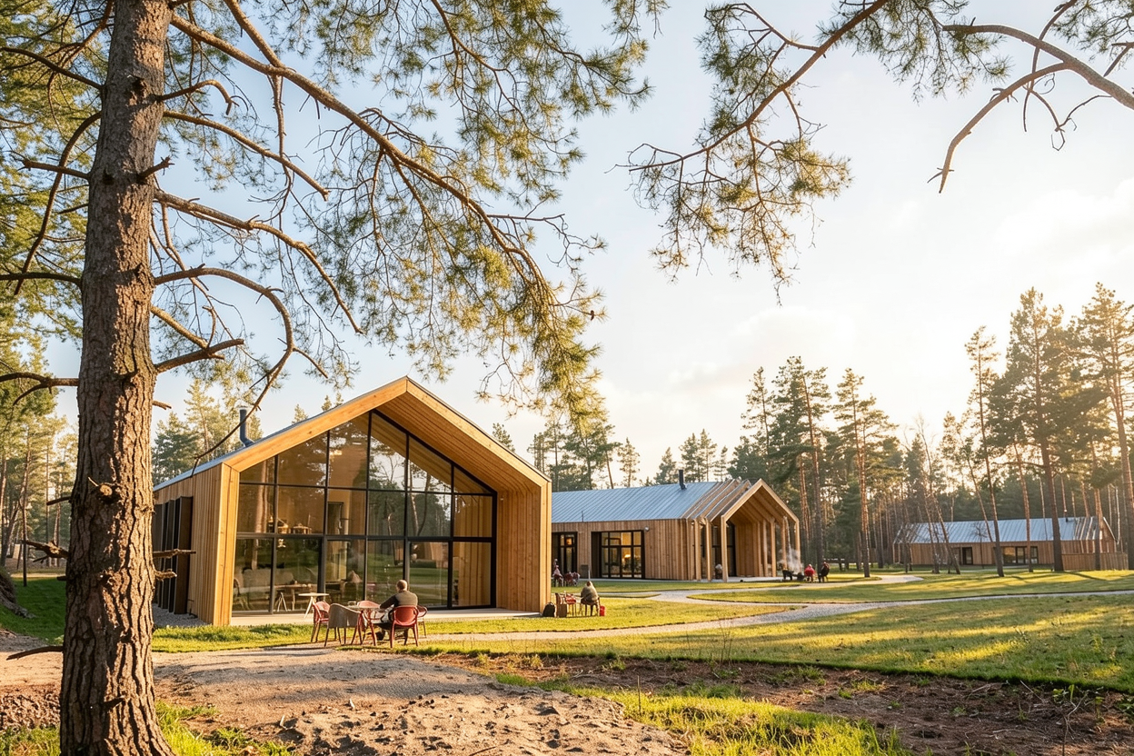 design a modern sailing center located by the waterfront surrounded by natural landscape the architecture should emphasize extensive use of wood including wooden facades large timber beams wooden decking and structural glulam elements the building should combine contemporary scandinavian design with a warm natural aesthetic include large panoramic glass windows facing the marina a spacious wooden terrace overlooking the water and a sloped roof inspired by nautical forms the sailing center should feature boat storage areas a clubhouse with a lounge changing rooms a sailing school classroom and a caf with outdoor wooden seating use natural materials such as oak cedar and larch the atmosphere should feel elegant eco friendly and harmonious with nature add sailboats docked nearby soft sunset lighting reflecting on the water and people in sailing attire the visualization should be photorealistic high resolution architectural render style wide angle view cinematic lighting ultra detailed textures 4k quality