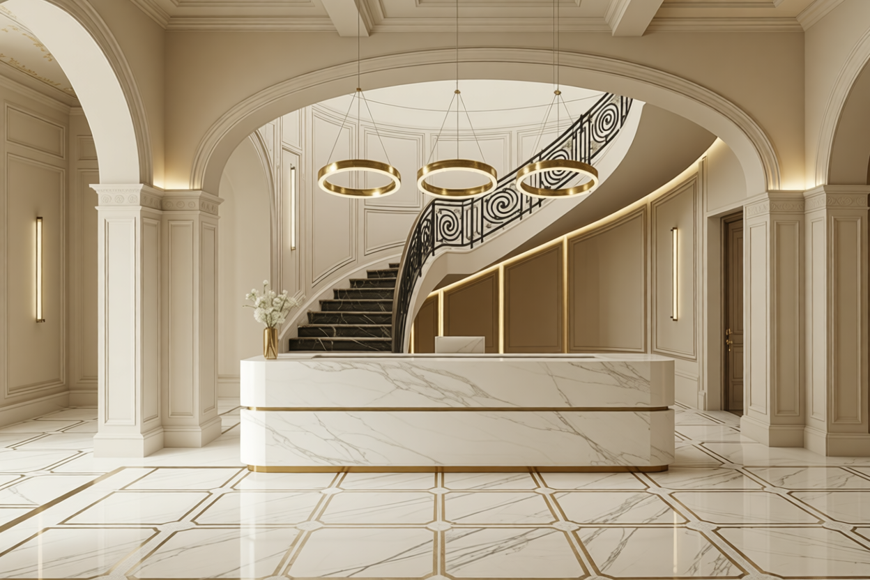 change the floor design only replace the existing flooring with a contemporary marble pattern light cream marble base with subtle geometric lines add thin black marble accents for contrast include very fine brushed brass inlays between marble slabs keep the pattern elegant restrained and symmetrical do not change walls reception desk lighting staircase or colors preserve scale perspective and architecture exactly