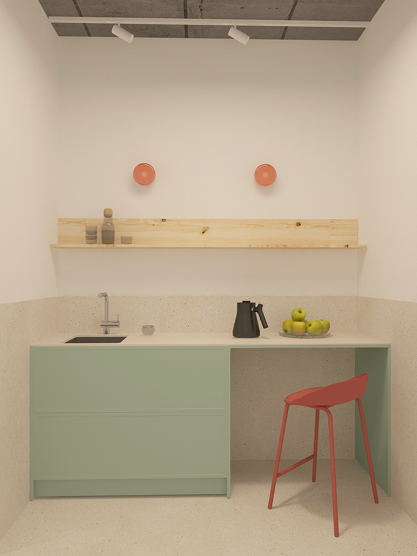 make this render better more accurate materials and soft artificial lighting from the ceiling walls are white only ceiling is concrete