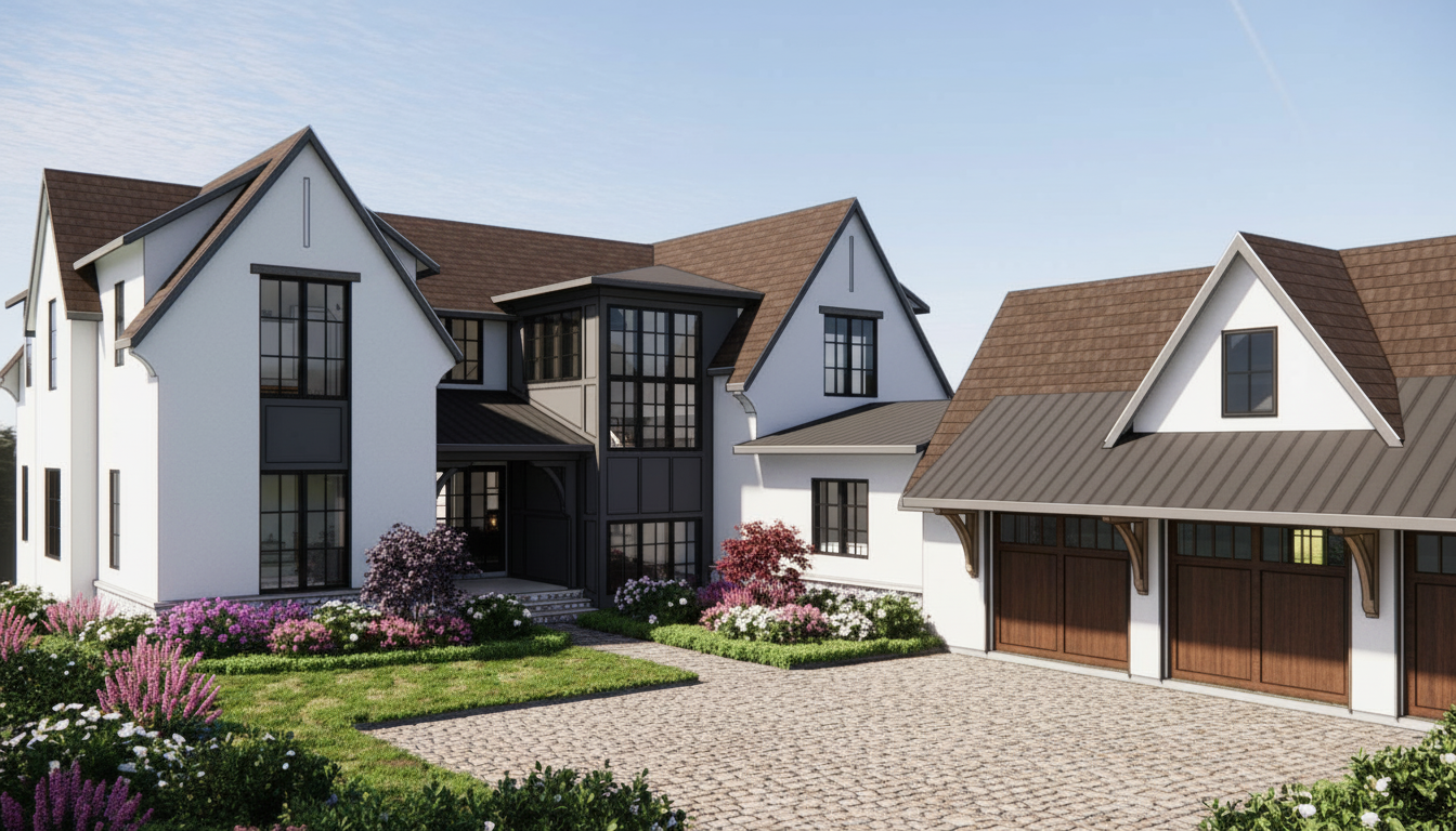 change stone material to fondulac change roof to wood shakes make wood dark walnut color make metal roof darker keep all other colors add landscaping in grassy areas make driveway granite cobbles