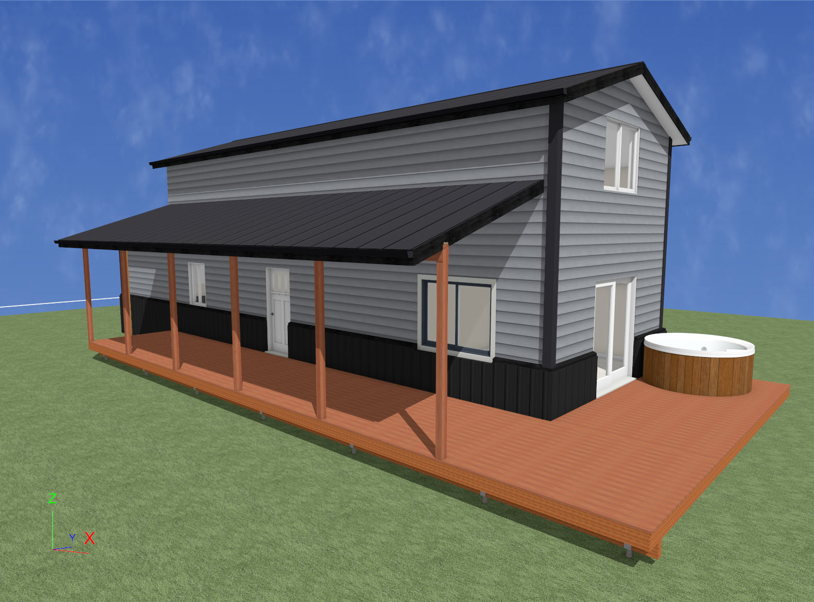 hyper realistic photo of new home in lush alaskan forest black metal siding and roofing with grey siding lovely new pt deck with hot tub dynamic lighting and ultra detailed