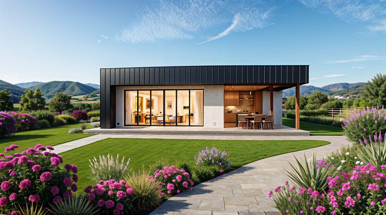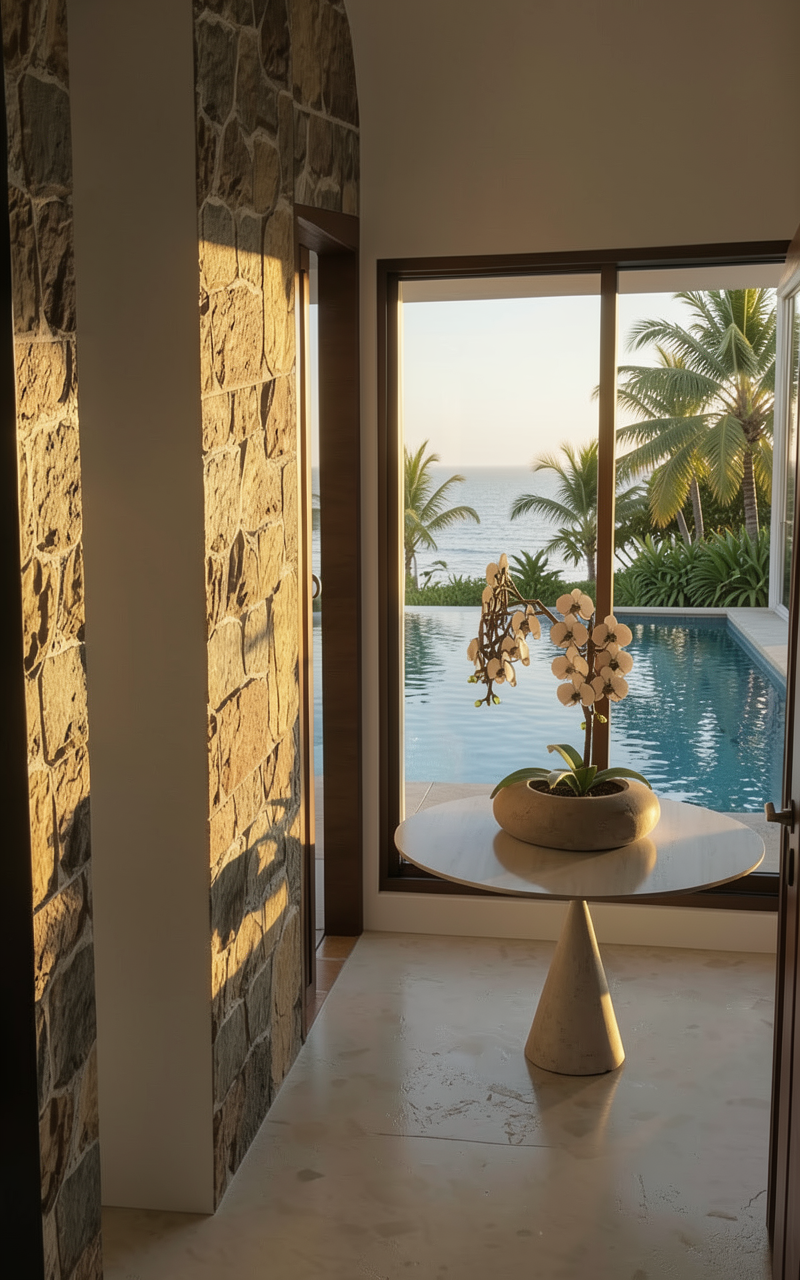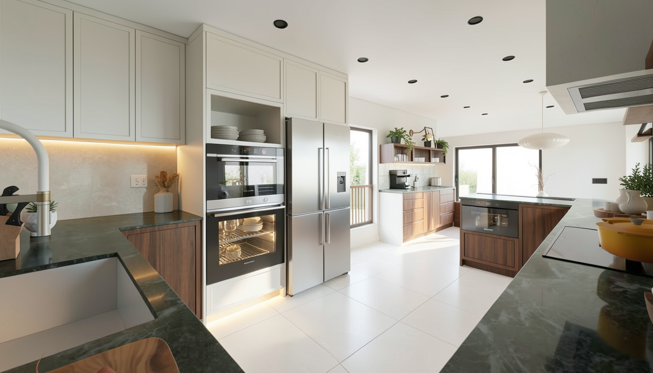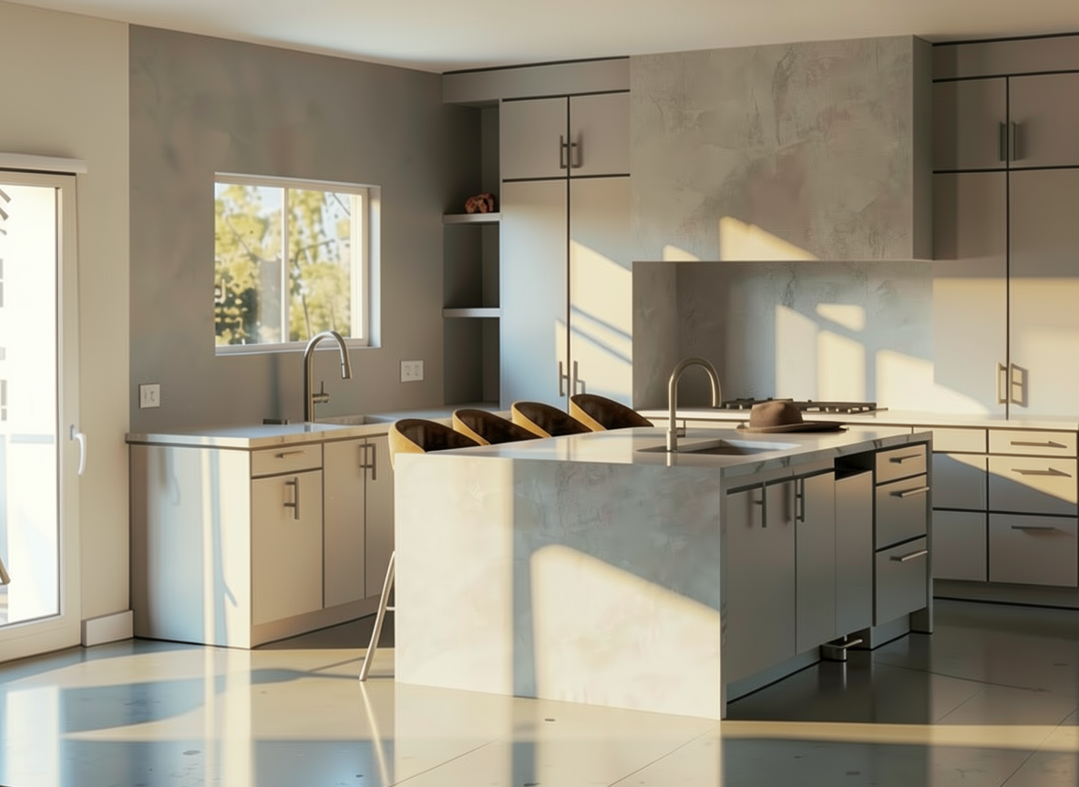render this japandi kitchen do not change the design dimension and materials in the model bring natural light through windows add the cabinet light to the sit on counter glass cabinet add linear led lights under the floating shelves countertop is dark green soapstone insert hood is off white micro cement the backsplash is porcelain slab with off white concrete look without any particles the wood cabinets are solid wood medium walnut kitchen floor is 24 x 24 porcelain tile in off white concrete look without any particles