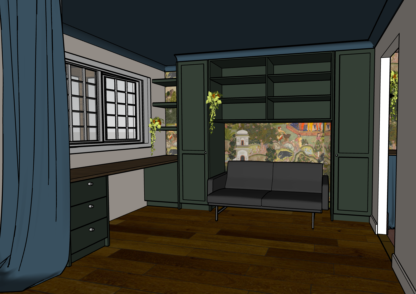 render highest quality photorealism and textures wallpaper to be maintained ceiling painted to match cabinets walls to be white lit by downlights bulkhead above cabinets to ceiling 50mm cornice to all ceiling and bulkhead