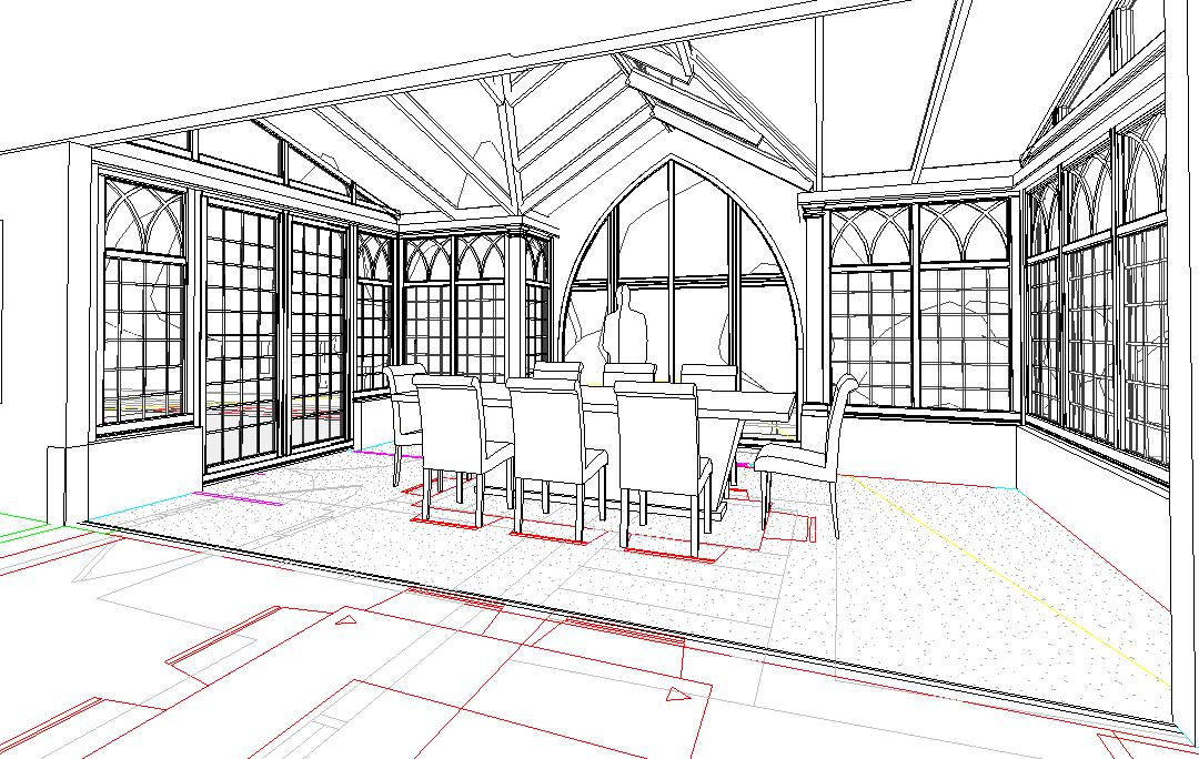 render a beautifully detailed architectural visualization of a kitchen looking into a conservatory with a classic design the exterior walls should be painted in warm beige with subtle stone textures the large arched windows are framed in warm brown the wooden trims and support beams should be a deep mahogany the roof of the conservatory is glass through which you can see a mostly sunny sky the atmosphere is charming and tranquil set in the late afternoon with soft golden sunlight casting gentle shadows lush greenery surrounds the dining table