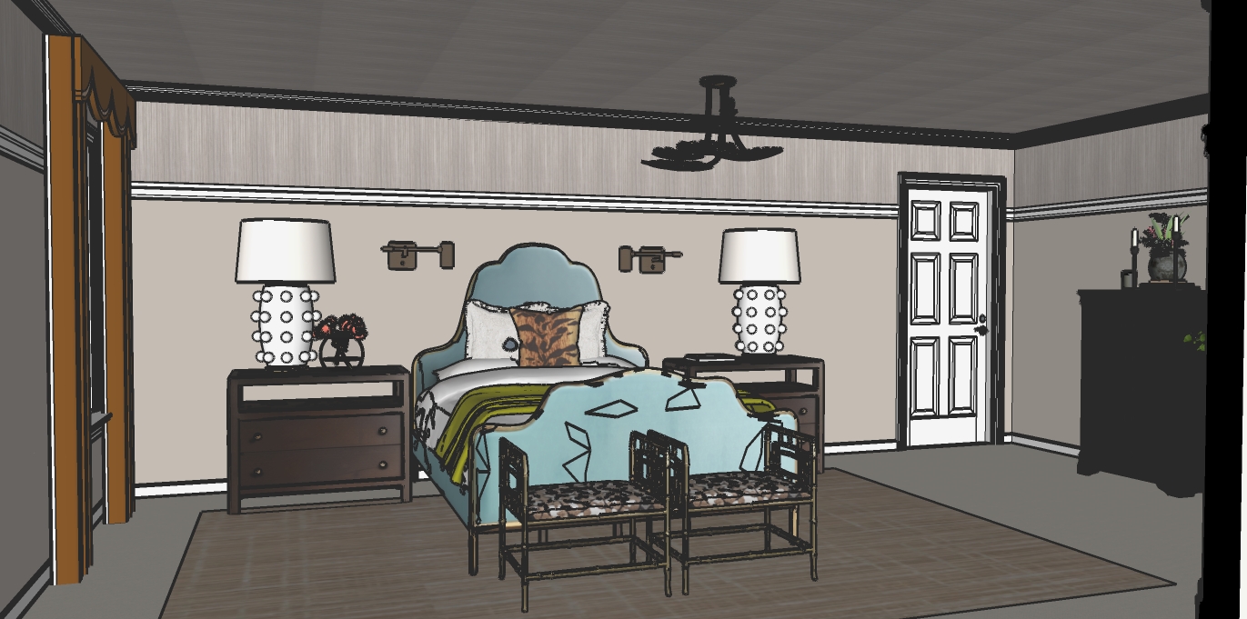 the floor is an off white carpet with a rust brown color rug the bench at the end of the bed as a gold frame the headboard and the footboard have a gold metal frame around the blue fabric the ceiling is a taupe grasscloth wallpaper like the upper part of the wall add light coming from the ceiling light and the reading sconces