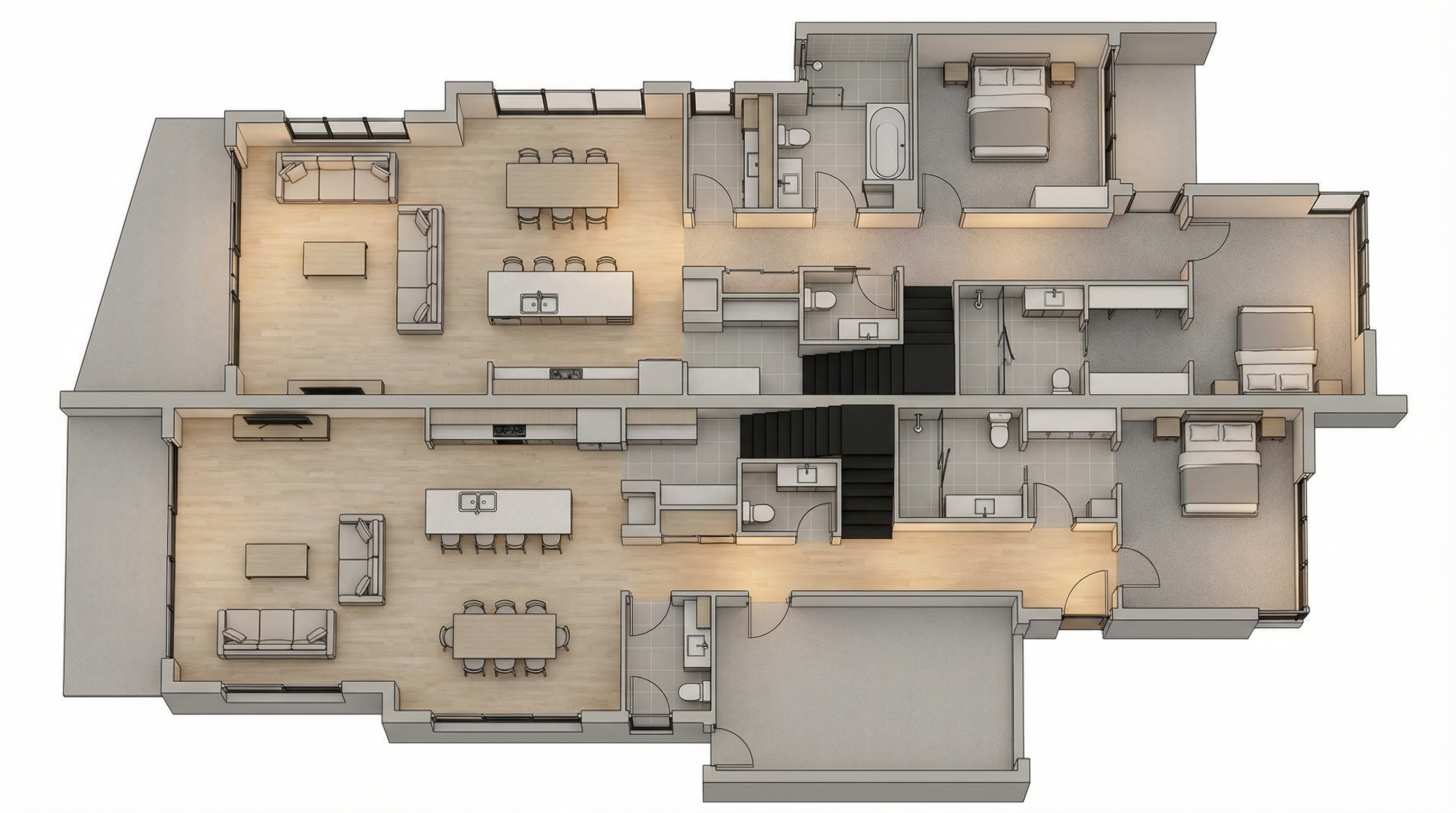 convert this floor plan into a architectural isometric 3d view of a full house show the space from an elevated angle with furniture walls and details visible this is the first floor of a side by side duplex townhouse tiles to be travertine carpet to be light grey floorboards to be light coloured stairs to be black use the same furniture as shows on the plan do not change the orientation of the floorplan