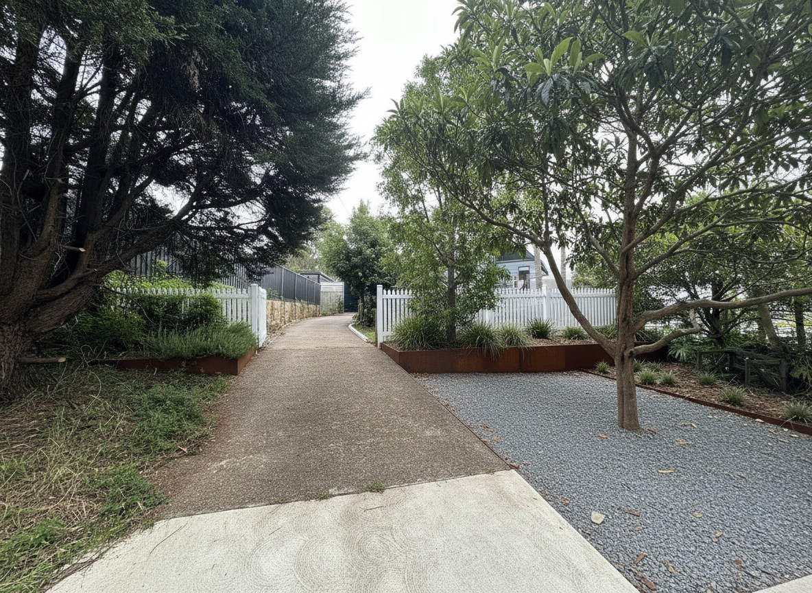 remove tree and hand side front right of image add appropriate neutral tones coating to driveway