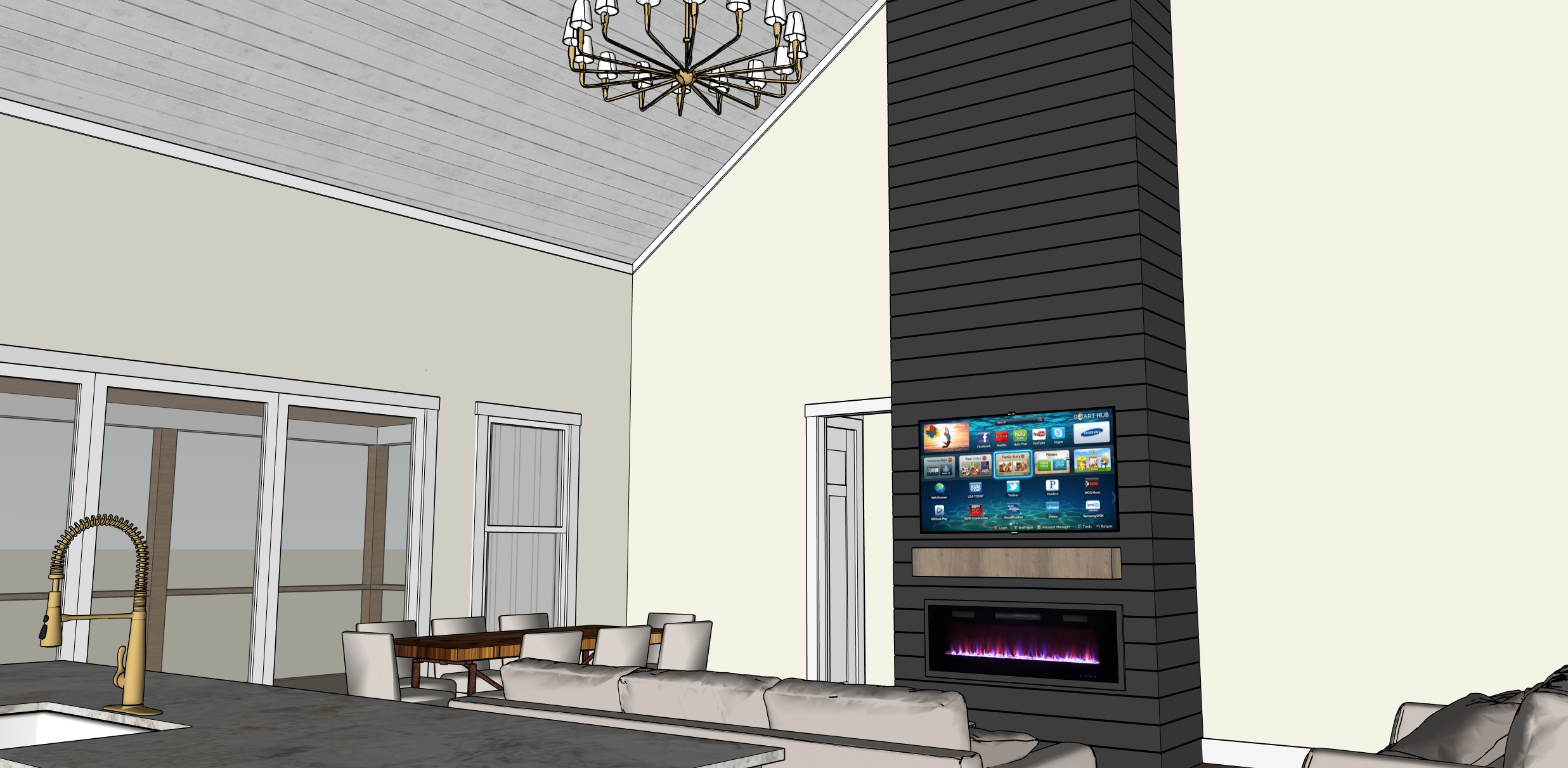 add decor wooded lot outside windows sherwin williams alabaster paint on walls white shiplap ceiling iron ore shiplap on electric fireplace make realistic add can recessed lighting