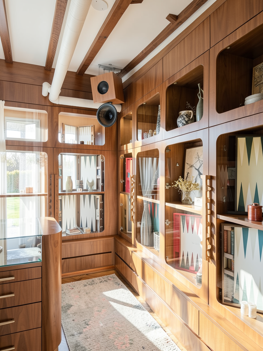 place foosball table centered on back wall underneath artwork accessorize shelves on the right with some books and some decorations soften linear lighting at bookshelves and show as soft warm light