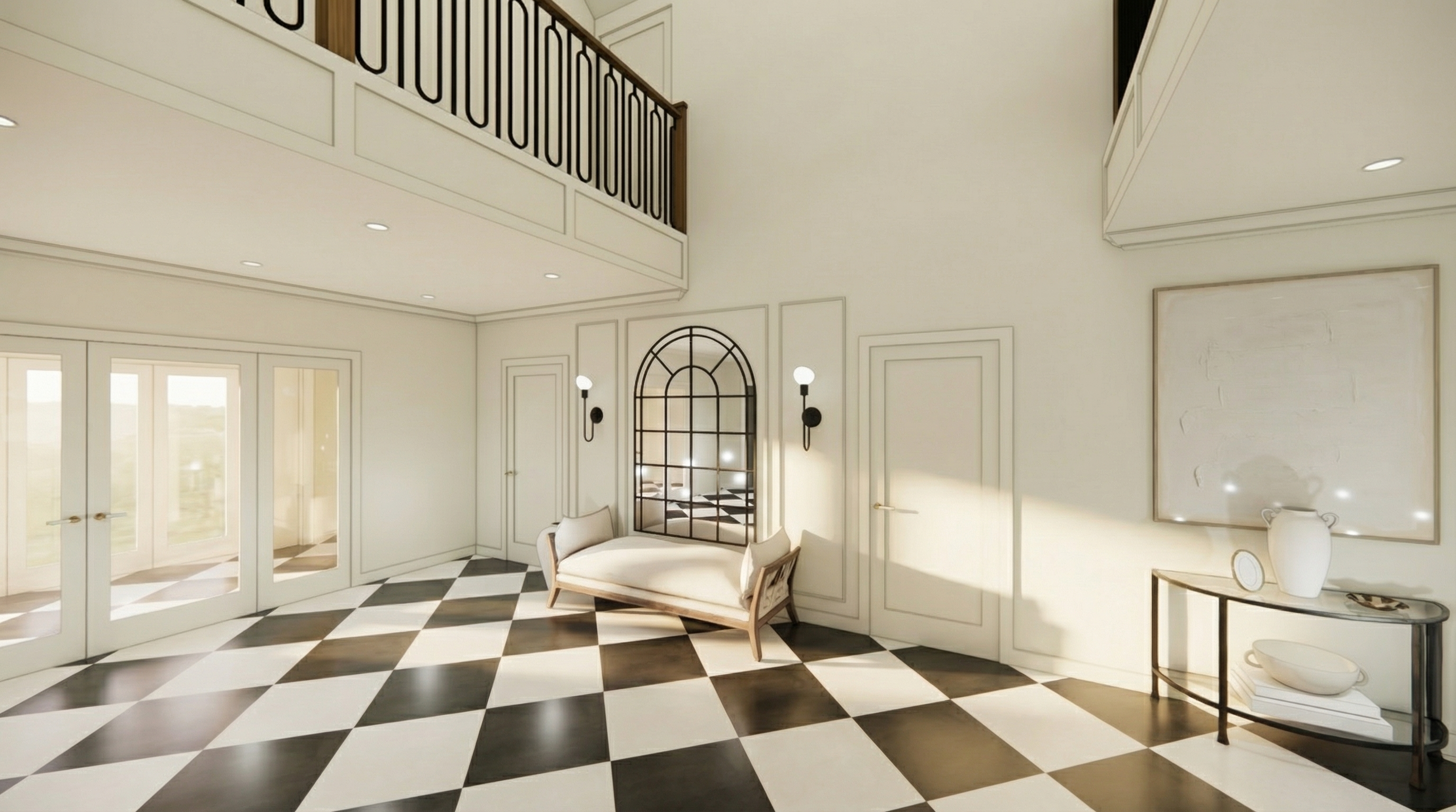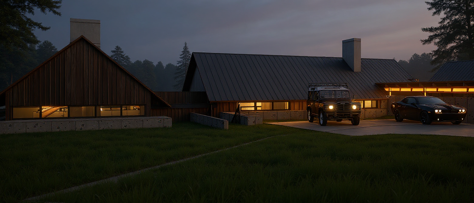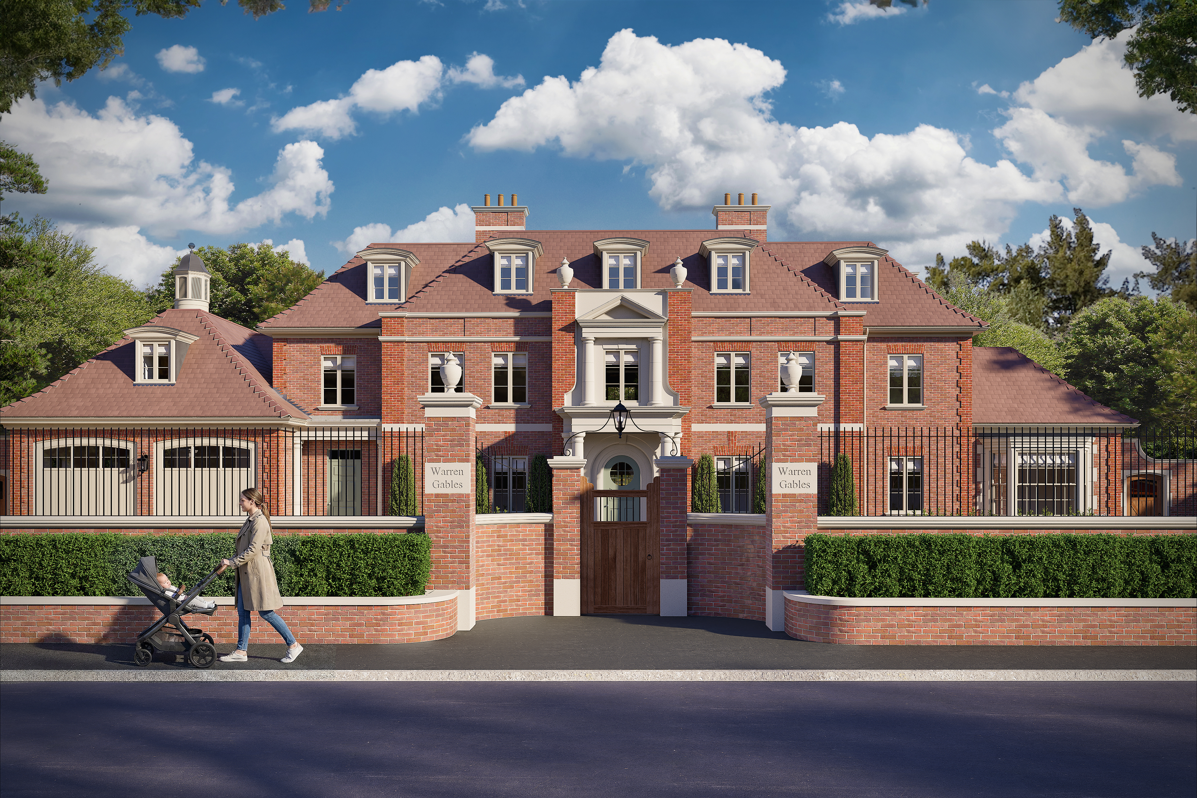 ultra photorealistic architectural exterior render of a large symmetrical georgian style brick mansion re rendered from the provided image reference natural uk daylight soft late afternoon sun with realistic shadows highly detailed red brickwork with subtle colour variation and mortar texture stone window surrounds and classical entrance portico with crisp carved detailing slate roof with realistic weathering lead flashings chimneys with clay pots real glass reflections in windows with slight interior depth visible black wrought iron railings and gates with accurate metal wear manicured hedges and planting with natural irregularity realistic asphalt road and pavement textures photographic depth of field physically accurate lighting global illumination ray traced reflections shot on a full frame dslr 35mm lens eye level perspective no stylisation no cgi look no painterly effects indistinguishable from high end architectural photography