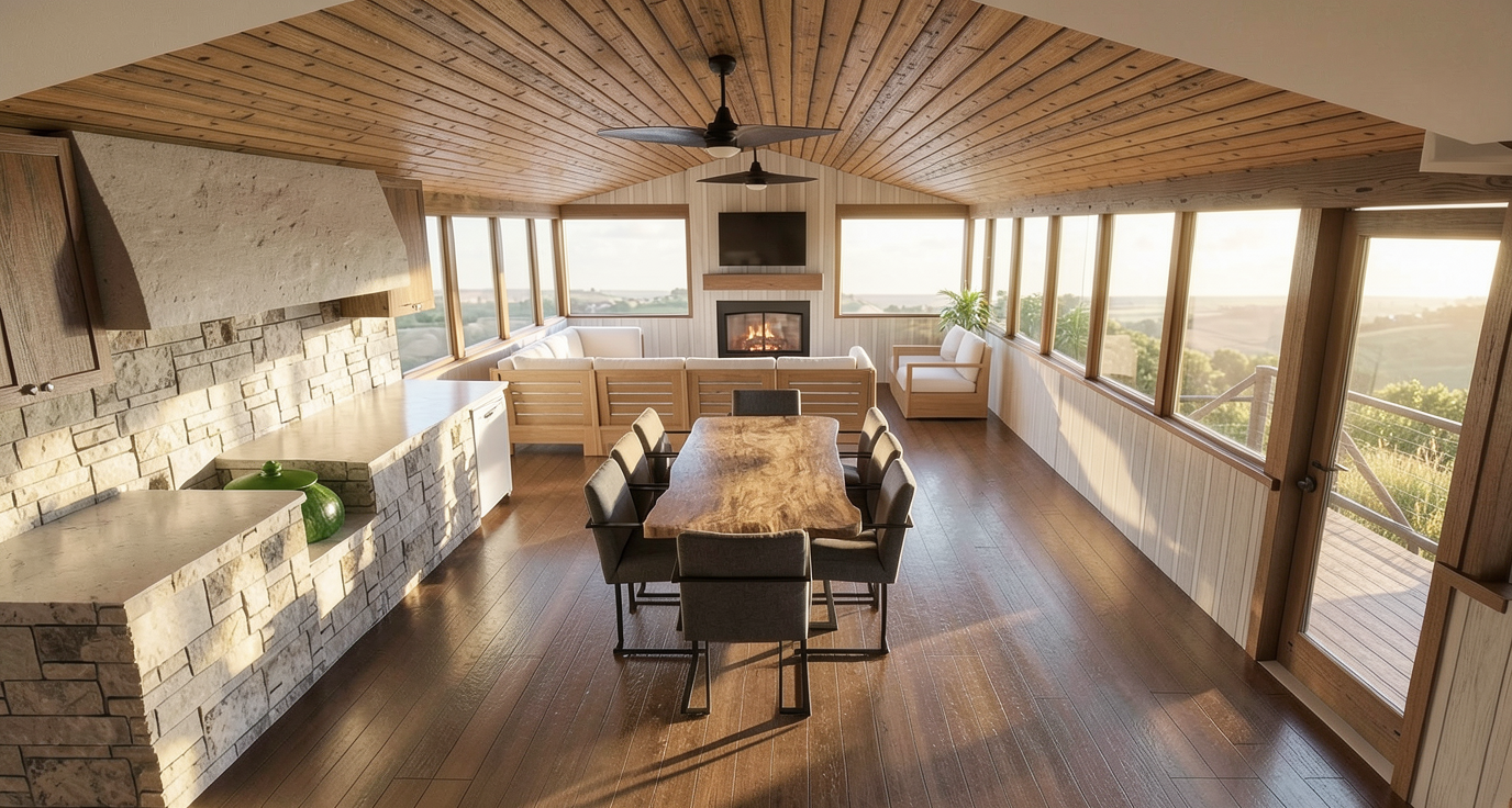 do not add new ceiling lights or shelving in walls add dining table in foreground