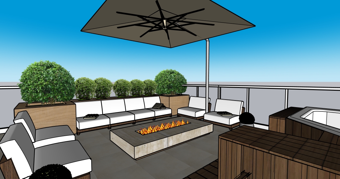 render a luxurious modern outdoor patio with a sophisticated atmosphere include a sleek fire pit with a warm glowing flame use a light taupe for the seating area fabric complemented by rich dark brown wood the stones on the wall should be a mix of soft beige and sandstone hues incorporate vibrant green for the plants and bushes to add freshness the floor should be slate gray and the sky a clear bright blue indicating a calm sunny day ensure the canopy is a neutral stone color creating a relaxing shaded area as background a lake and mountain view