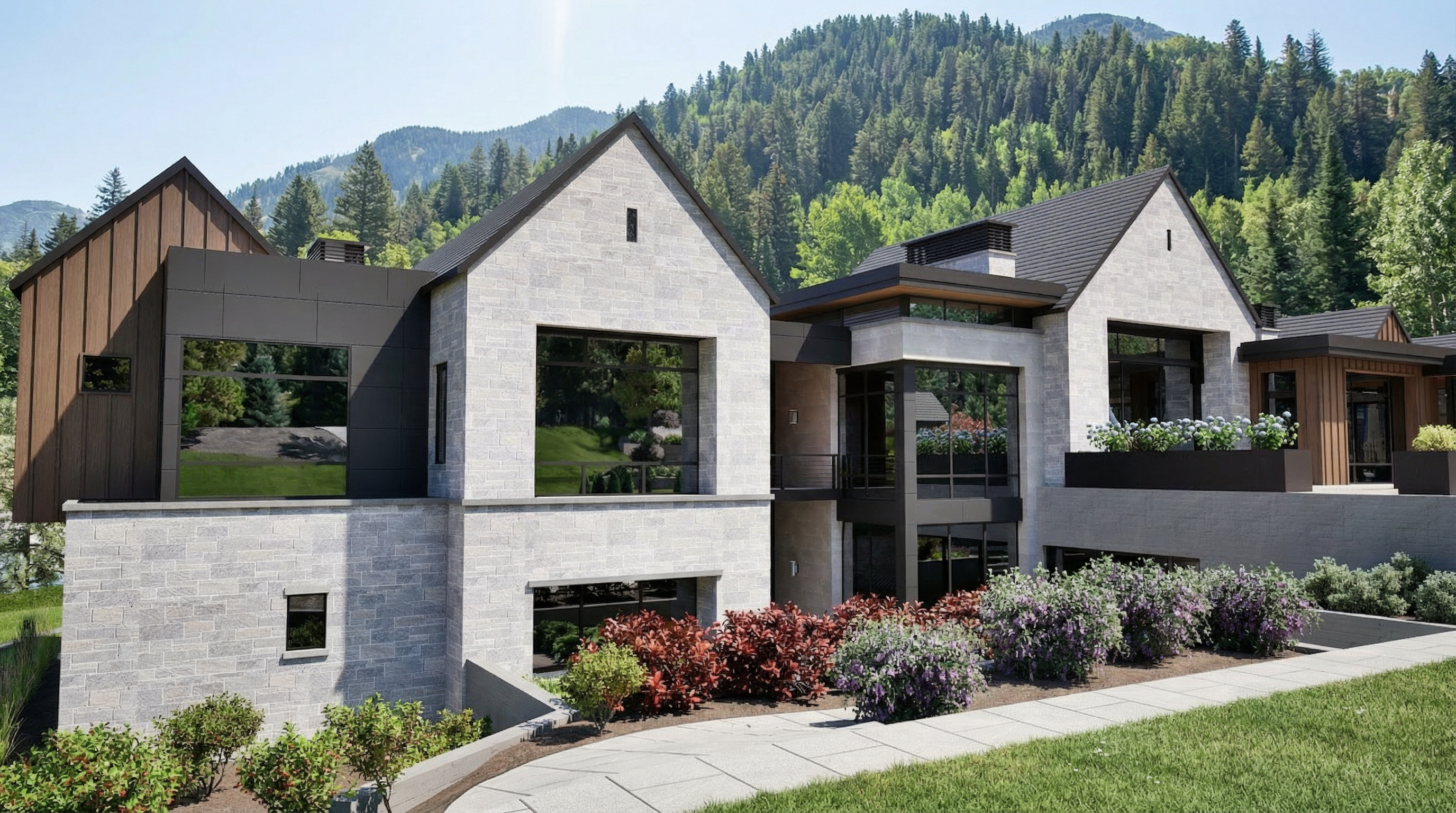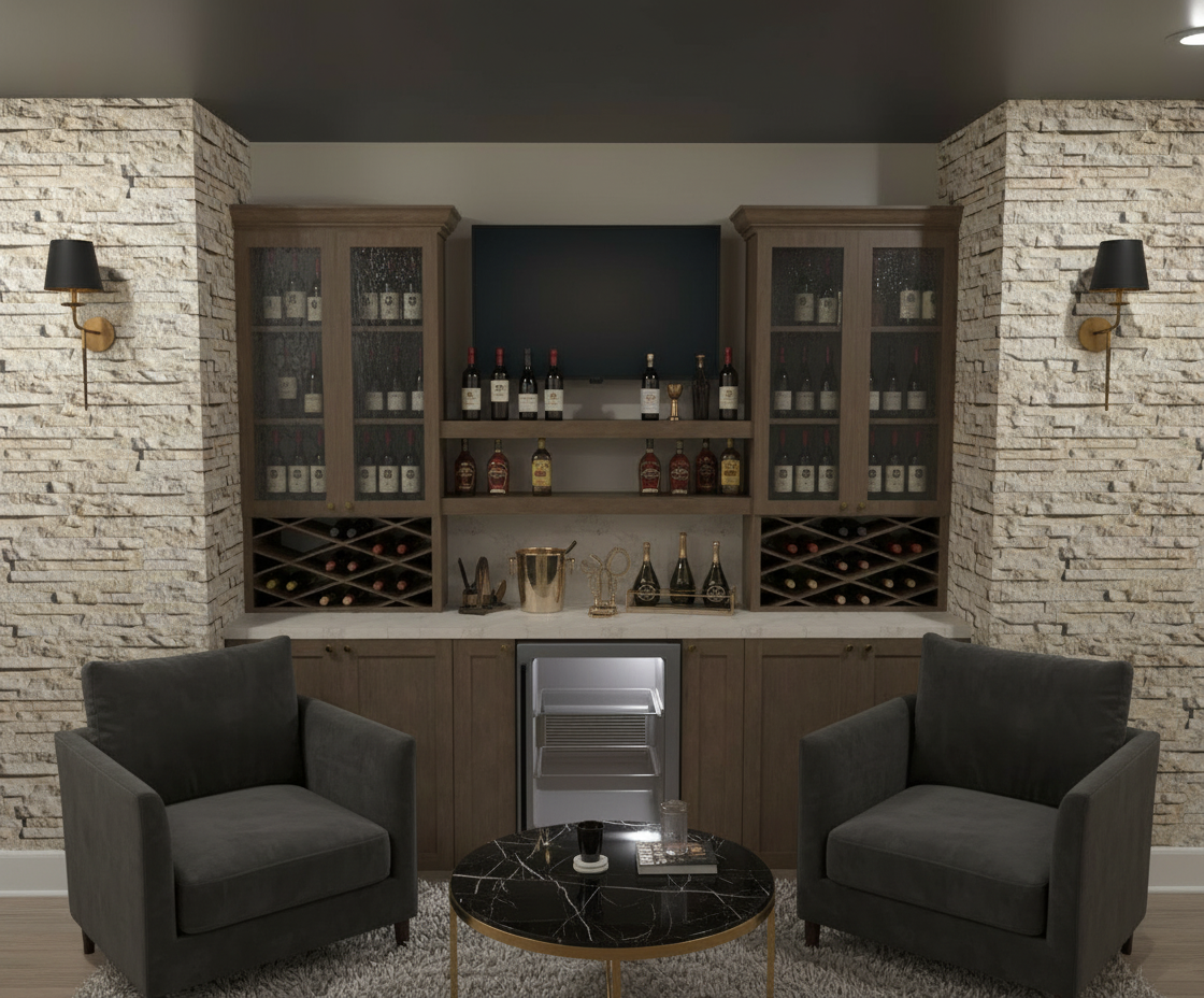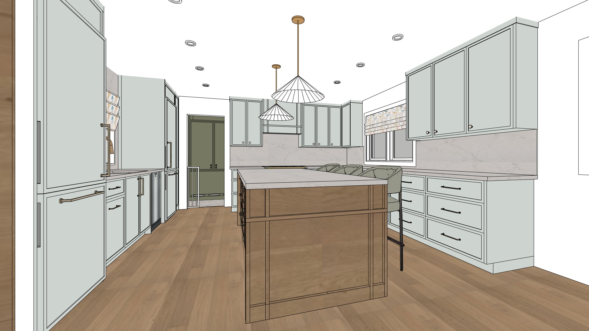 photorealistic interior render of a high end residential kitchen strictly matching the reference image in layout proportions camera angle and architectural elements with absolutely no changes to furniture placement cabinet layout or spatial configuration all cabinetry is custom full height millwork extending all the way to the ceiling cabinet color is sherwin williams sw 7652 mineral deposit a light green gray with a gray forward undertone low saturation cool neutral base and a very subtle sage presence the color reads primarily as a soft mineral gray with green appearing gently and never dominating no yellow olive mint blue or warm undertones finish is smooth matte to soft eggshell non reflective and refined cabinet doors are classic shaker style with clean rails and stiles consistent reveals and precise proportions the kitchen includes two fully integrated panel ready refrigerators completely concealed behind matching millwork panels so they visually read as continuous cabinetry with no visible stainless steel surfaces a large central island anchors the space the island base matches the cabinetry color sw 7652 mineral deposit and features applied decorative solid oak wood paneling on the sides and back of the island the oak wood is light neutral and desaturated with no red orange or yellow undertones the wood grain is natural straight and subtle finished in a matte clear coat the island countertop is a light stone surface with soft low contrast veining and a clean elegant appearance flooring is wide plank oak hardwood with a light to medium tone and neutral undertone matte finish and natural grain variation the floor must not appear reddish orange or overly warm countertops and full height backsplash are a light creamy stone with subtle marble inspired veining low contrast and a seamless installation behind perimeter cabinets cabinet hardware and plumbing fixtures are brushed brass with a soft satin sheen the kitchen faucet is brushed brass with a classic timeless profile and accurate scale lighting consists of recessed ceiling spot lights only evenly spaced across the ceiling with minimal trim and no decorative ceiling fixtures besides the pendants above the island two identical decorative pendant lights hang symmetrically and aligned with the island length the pendants feature a sculptural pleated cone shaped shade made of thin white or off white material with visible vertical ribbing the shade is semi opaque and softly diffuses light the pendant structure stem and canopy are finished in warm brushed brass the canopy is circular minimal and flush mounted to the ceiling the pendants are turned on and emit a soft warm internal glow that subtly illuminates the island surface without harsh brightness the pendants act as accent lighting and visual focal points not task lights natural daylight enters through the window soft and diffused preserving the true colors of cabinetry wood and stone without color shifting camera is set at eye level with a moderate focal length to avoid wide angle distortion proportions are realistic and accurate especially the island depth cabinet height pendant scale and spacing the overall mood is calm timeless and editorial resembling high end interior photography materials show realistic texture depth shadows and subtle reflections with no stylization exaggeration or unrealistic contrast