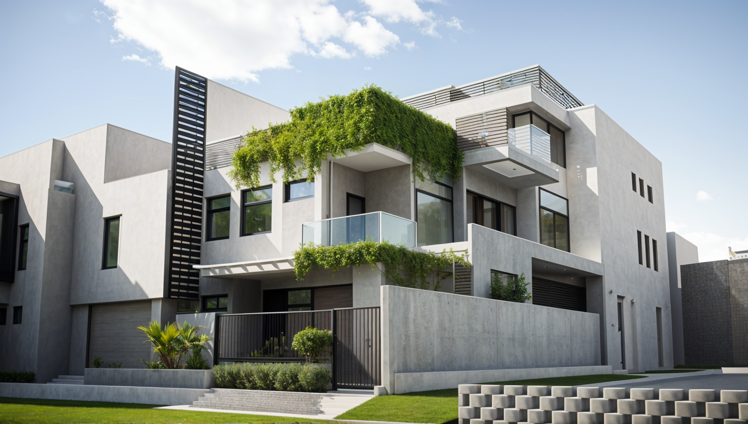photorealistic image base and main corner to be light gray stone the rest of the building should be a variation of white composite panels with black accent details trims canopies and window frames and shutters ambiance should be lively with people walking and some sparce lighting coming form withing the building garage doors to be solid black panels