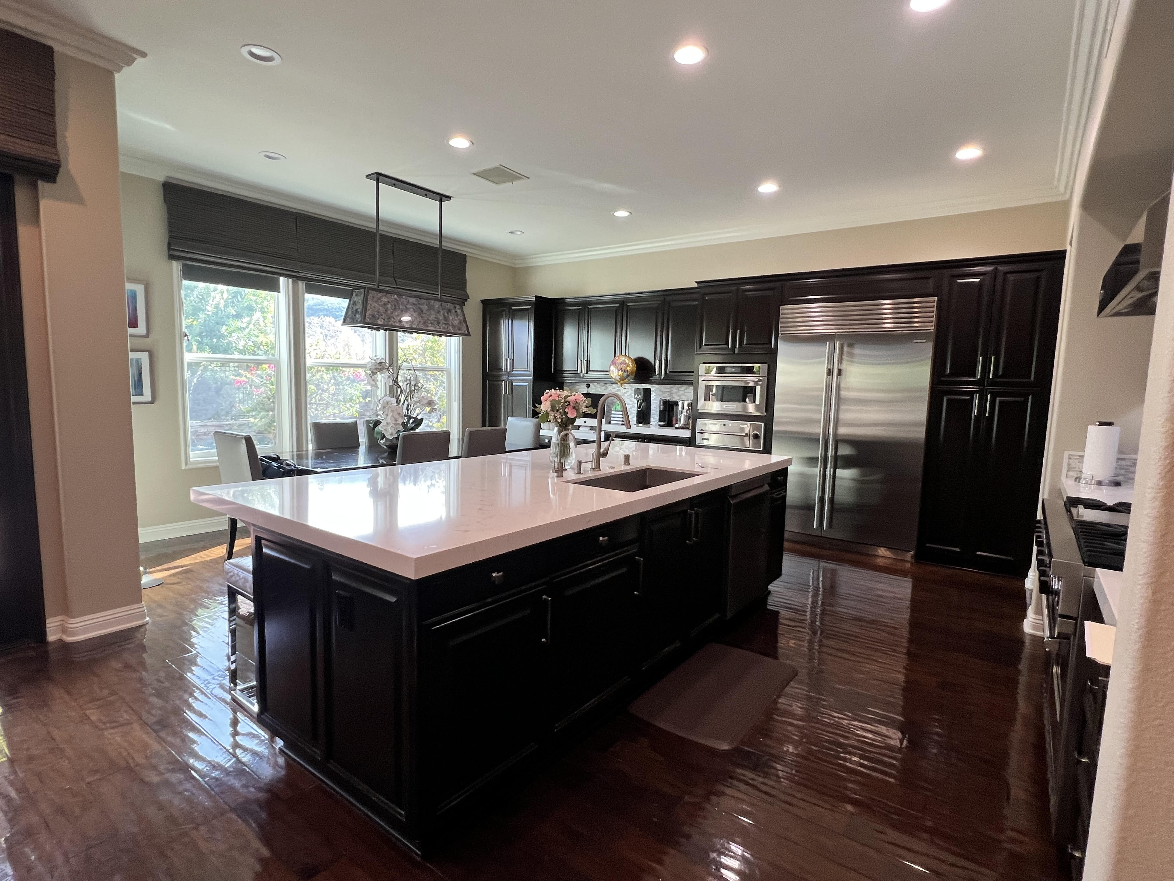 exterior shot make this kitchen look like these refrence images lighten the floor and remove the shininess completely shift the island closer to the wall on the right side change the cabinets from so dark to something still contrasting but not so dark change the light fixtures to more contemporary