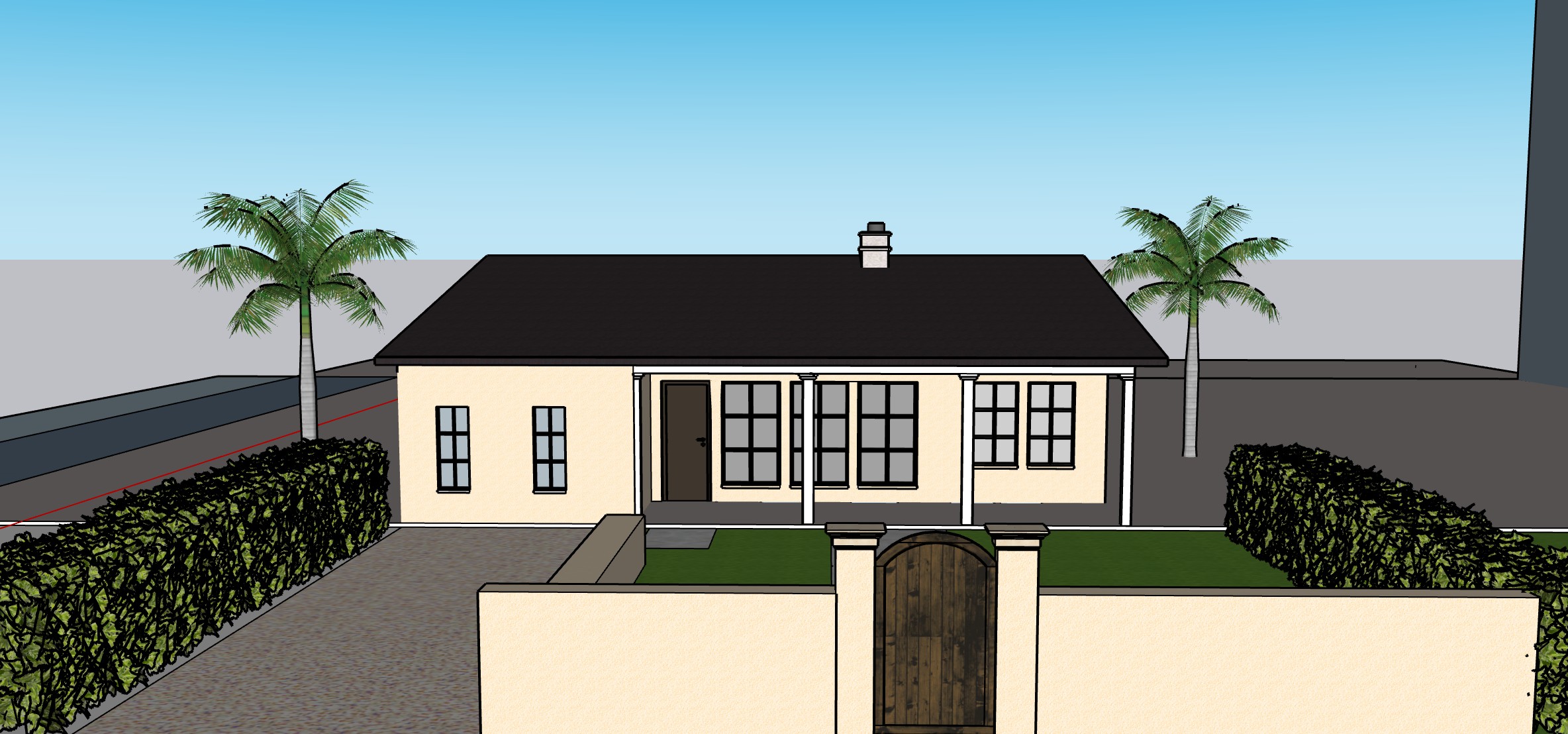 mediterranean revival exterior shot beautifully render a cozy single story house with cream colored walls and dark brown roof shingles the front yard is adorned with lush dark green hedges on both sides of a cream stone pathway include tall vibrant green palm trees swaying gently in the breeze the atmosphere is bright and inviting with a clear blue sky that gradually blends into a soft gradient near the horizon the wooden gate at the front is a rich dark brown complementing the house s door and window frames architecture