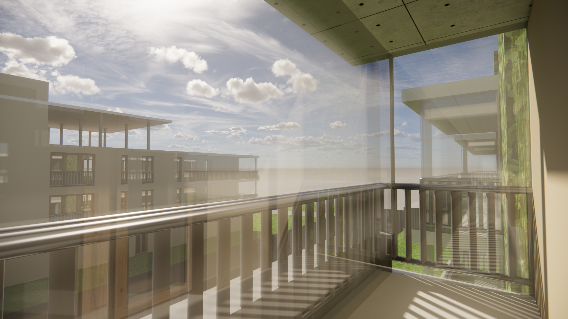 make a realistic render keep the photo as it is leaving the greenhouse windows but add details and change the ceiling color to a light color add trees in the outside area