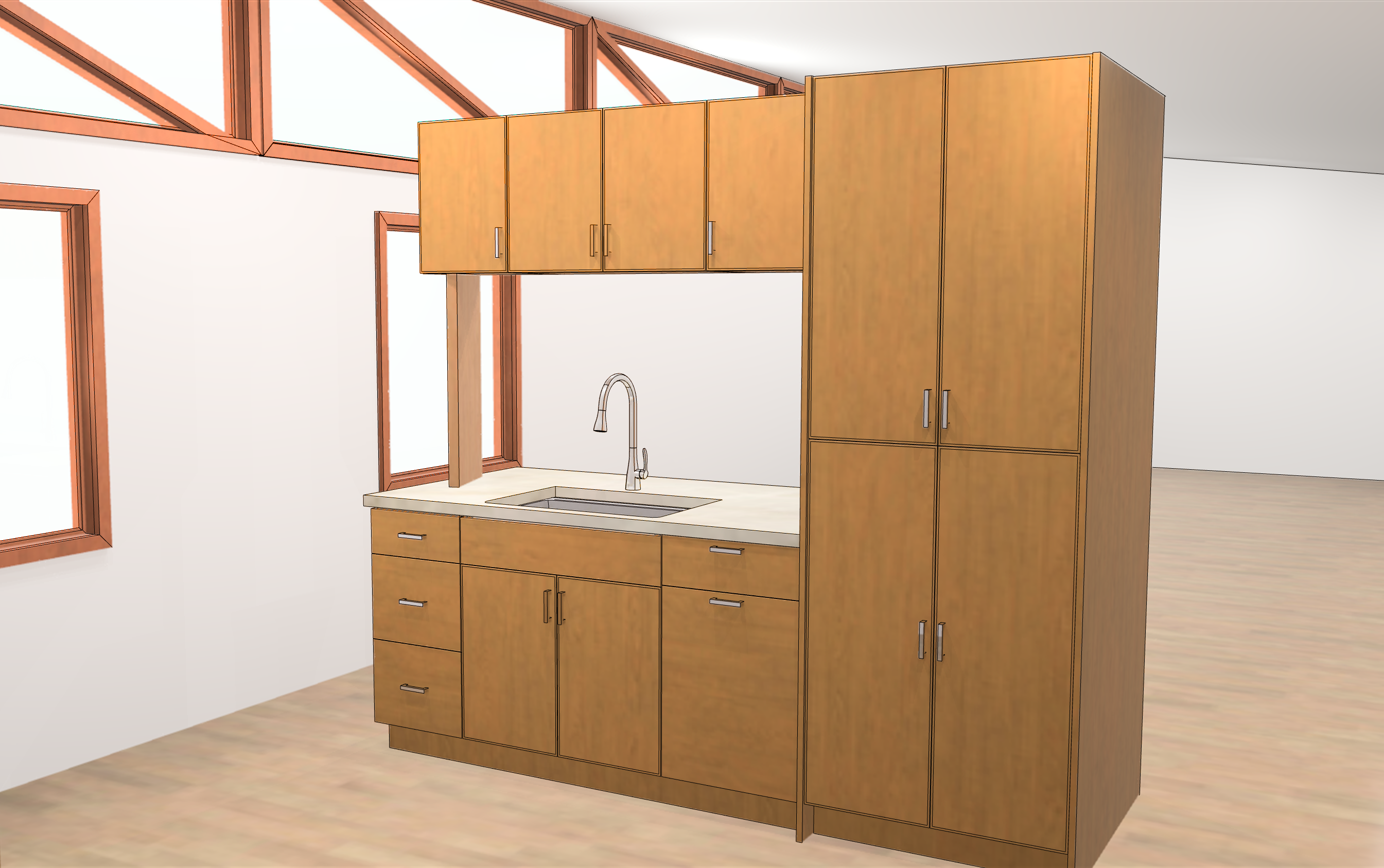 ultra realistic contemporary kitchen interior photorealistic architectural visualization soft natural daylight from large windows accurate global illumination and soft shadows window trim to match the cabinetry finish keep the floors the same soft warm wood planks custom soft caramel maple wood cabinetry warm undertones subtle natural grain satin finish modern flat panel doors with minimal hardware taj mahal quartzite countertops and backsplash with creamy beige base soft taupe and light gray veining polished stone surface with realistic light reflection and depth balanced warm color palette realistic textures and material depth true to life scale sharp focus high dynamic range professional interior photography style 8k architectural render ultra detailed natural and inviting atmosphere
