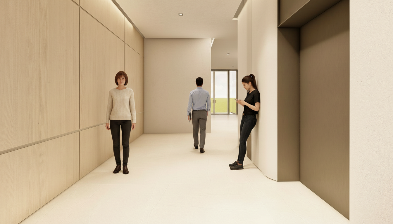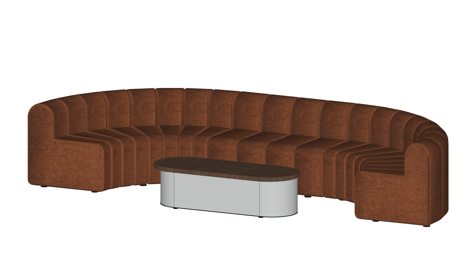this is an image of a coffee table with a chrome base and sand colored mortex top behind is a curved sofa use this furniture in a sleek and modern event setting with neutral colours do not change the dimensions of the furniture