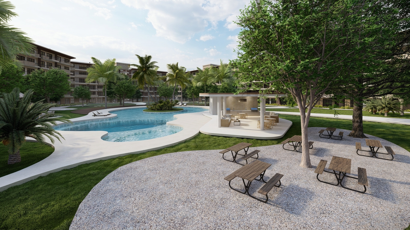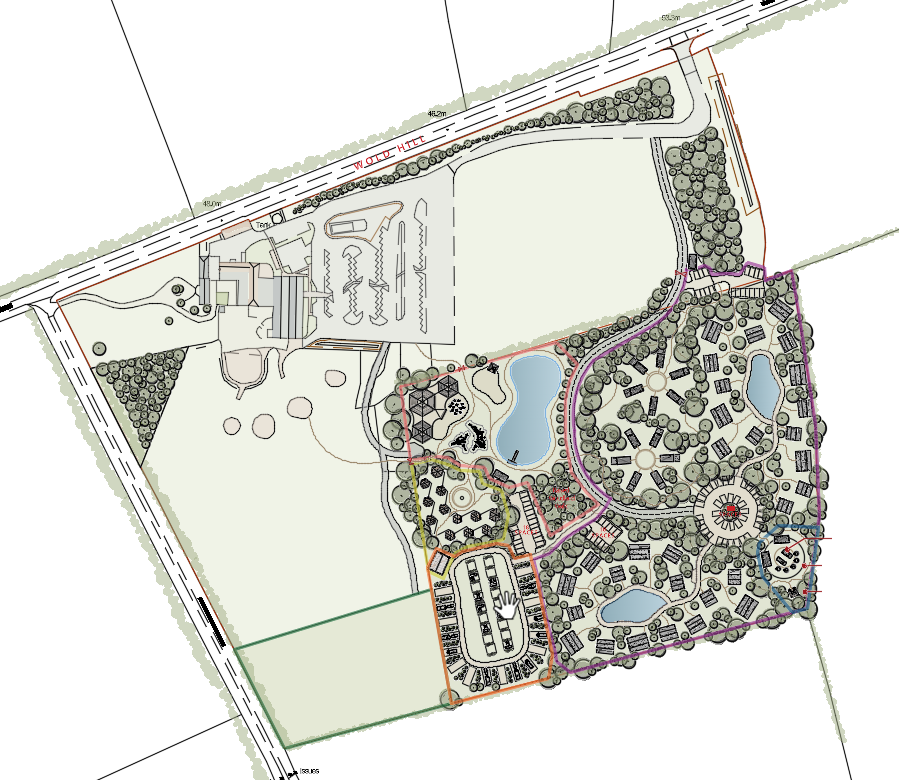 create a detailed landscape rendering of a property map with rolling green fields dense green forests winding pathways and serene reflective blue ponds highlight the borders with a crisp red line for clarity capture the essence of a warm sunny day with soft natural lighting to enhance the vibrant green hues and the gentle blues add subtle textures to the fields and trees for a lush appearance and use a light neutral backdrop to enhance the focus on the property details ensure a sense of peace and tranquility throughout the scene