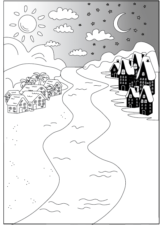 make this picture in color dont change anything just make it colorfull green grass bright sun in the left side and snowy on the right all bright cartoon style materials is sharp just a litle