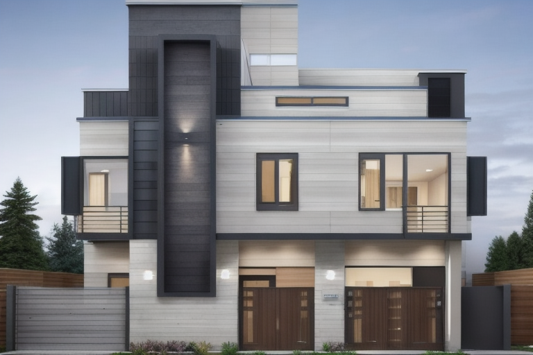 contemporary exterior shot create a modern elevation design for a g 1 residential building ensuring the geometry proportions and structural layout exactly match the uploaded reference image do not alter the massing window placements balcony positions or overall form enhance the fa ade with contemporary materials such as textured stone wooden cladding and muted exterior paints add sleek glass railings modern led strip lighting and a well defined entrance maintain realistic shadow depth and architectural detailing present a clean premium residential look while strictly retaining the original geometry of the building architecture