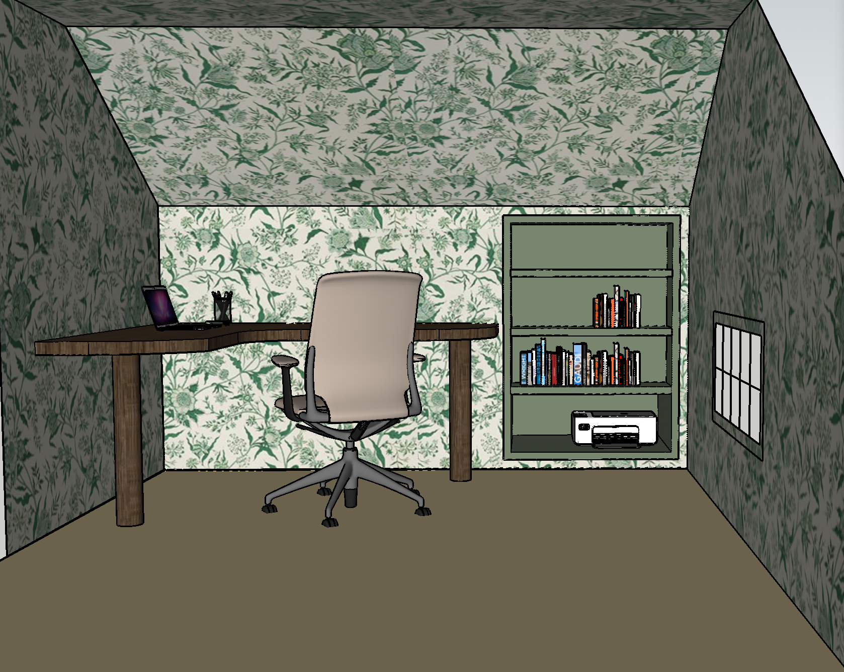 please render this image exactly as shown please add a wall sconce above the desk add soft lighting coming from the window on the right