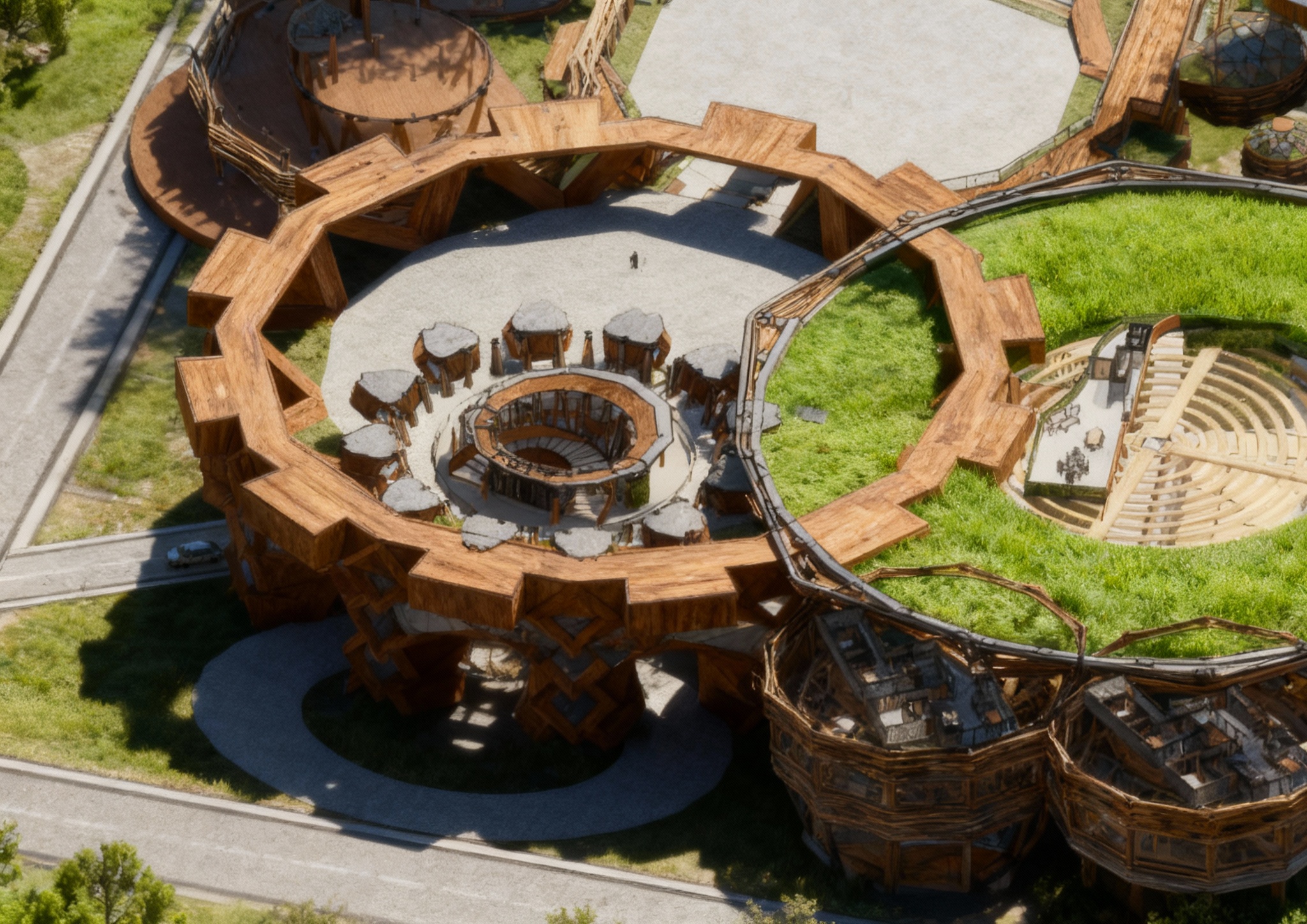 add tropical fern landscape behing the shelving seen through fluted glass the scenery outside is blue sky with forest the interior scene is brighter change image to ultra realistic photograph