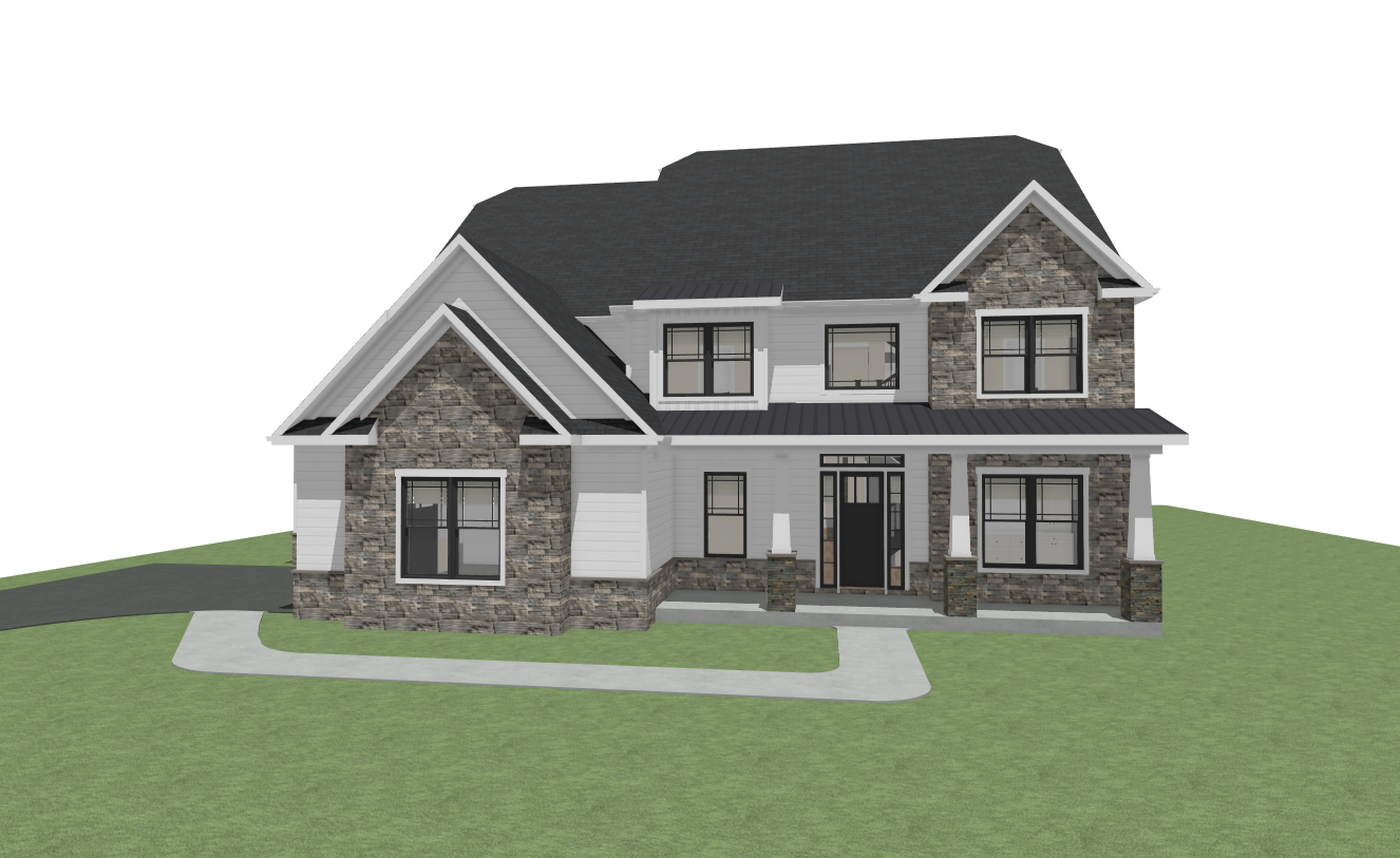 render this 3d image to appear photo realistic maintain all existing architectural materials and structural elements exactly as shown enhance the setting with a lush well maintained landscape include minimal beds manicured shrubs and a tree lined backdrop that frames the home naturally the windows should have a glossy finish with clear reflections of the surrounding trees and sky lighting should feel natural with soft shadows and realistic depth to bring the scene to life