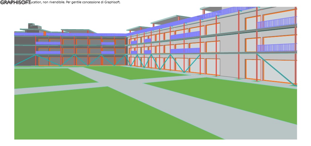 make a photorealistic render by adding vegetation on the facade people and trees as in the reference photo make it realistic