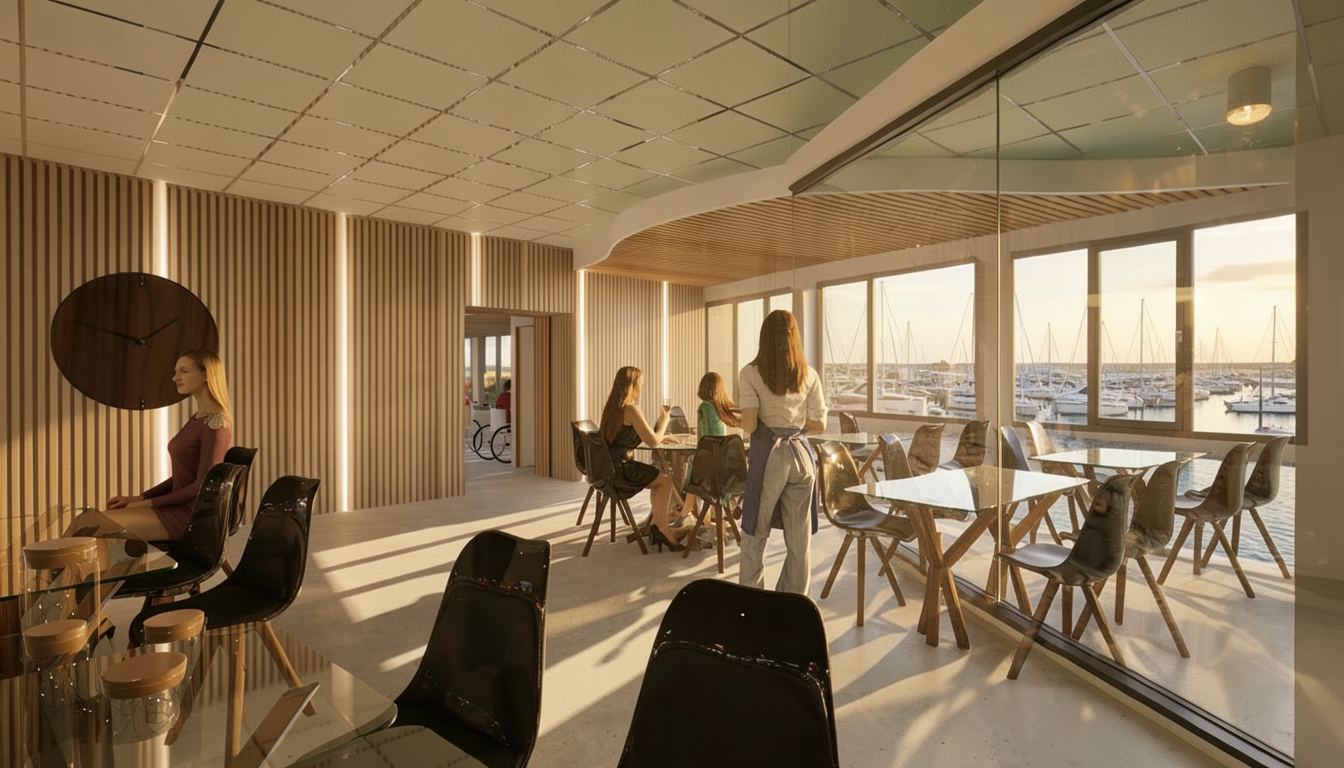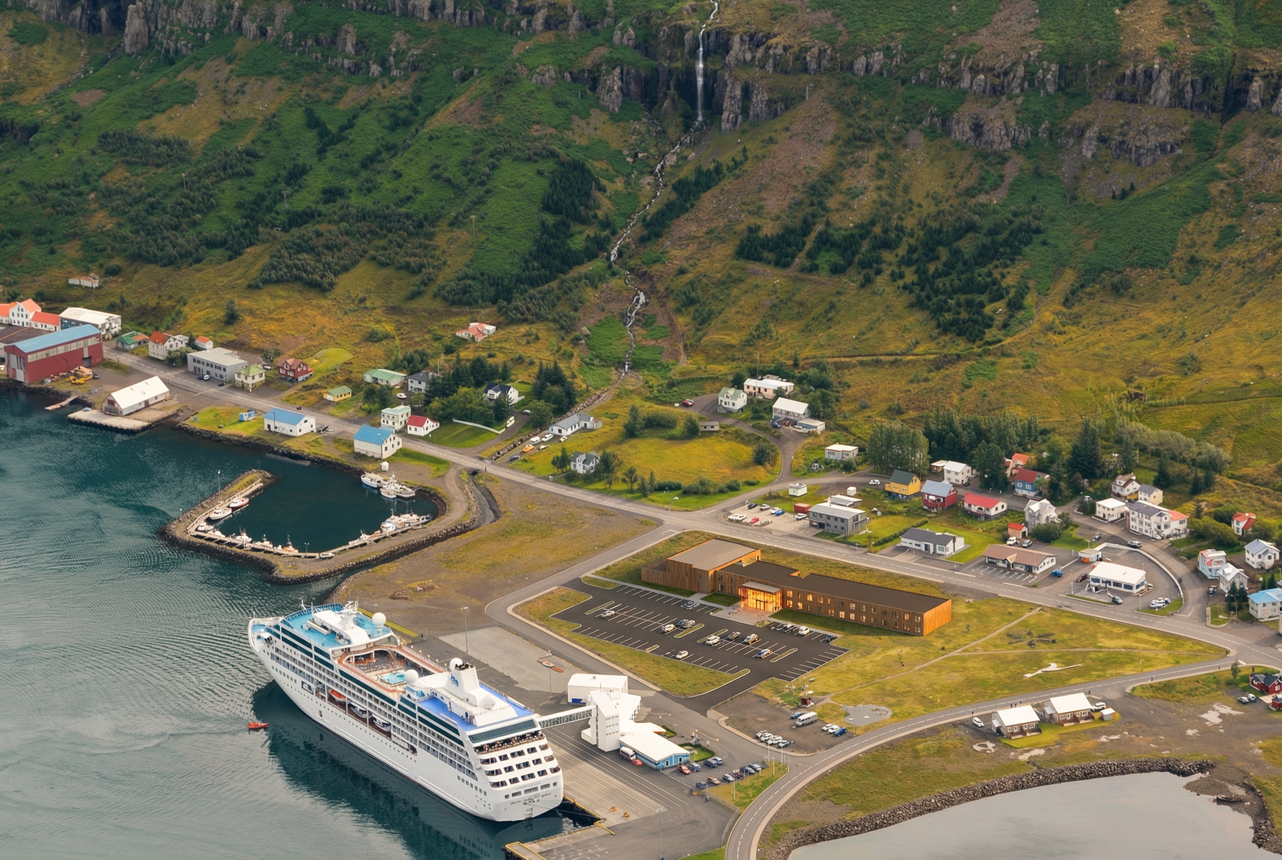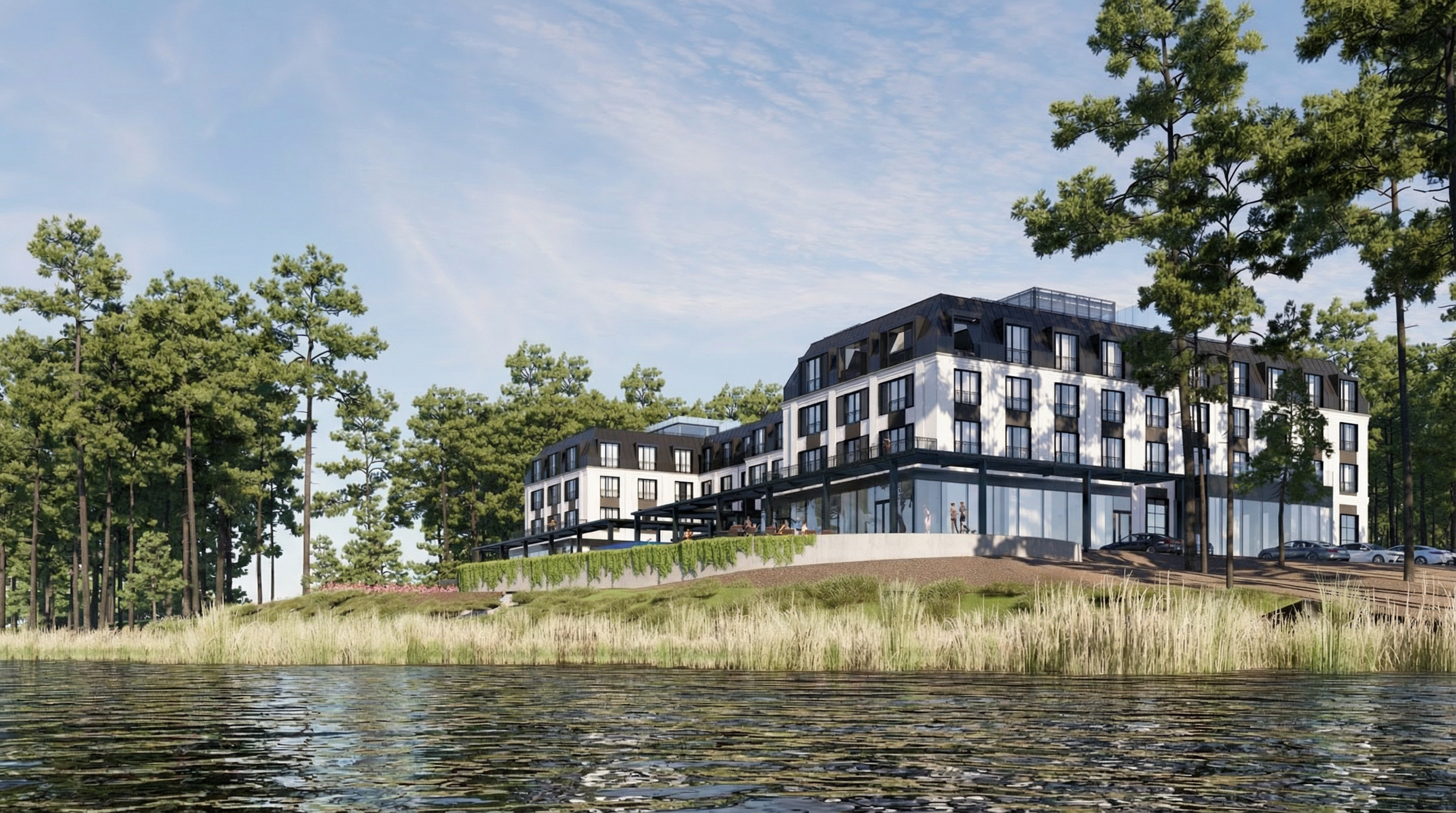 add afternoon sunset lighting change wood material and texture to be oak add parking lot in front of hotel